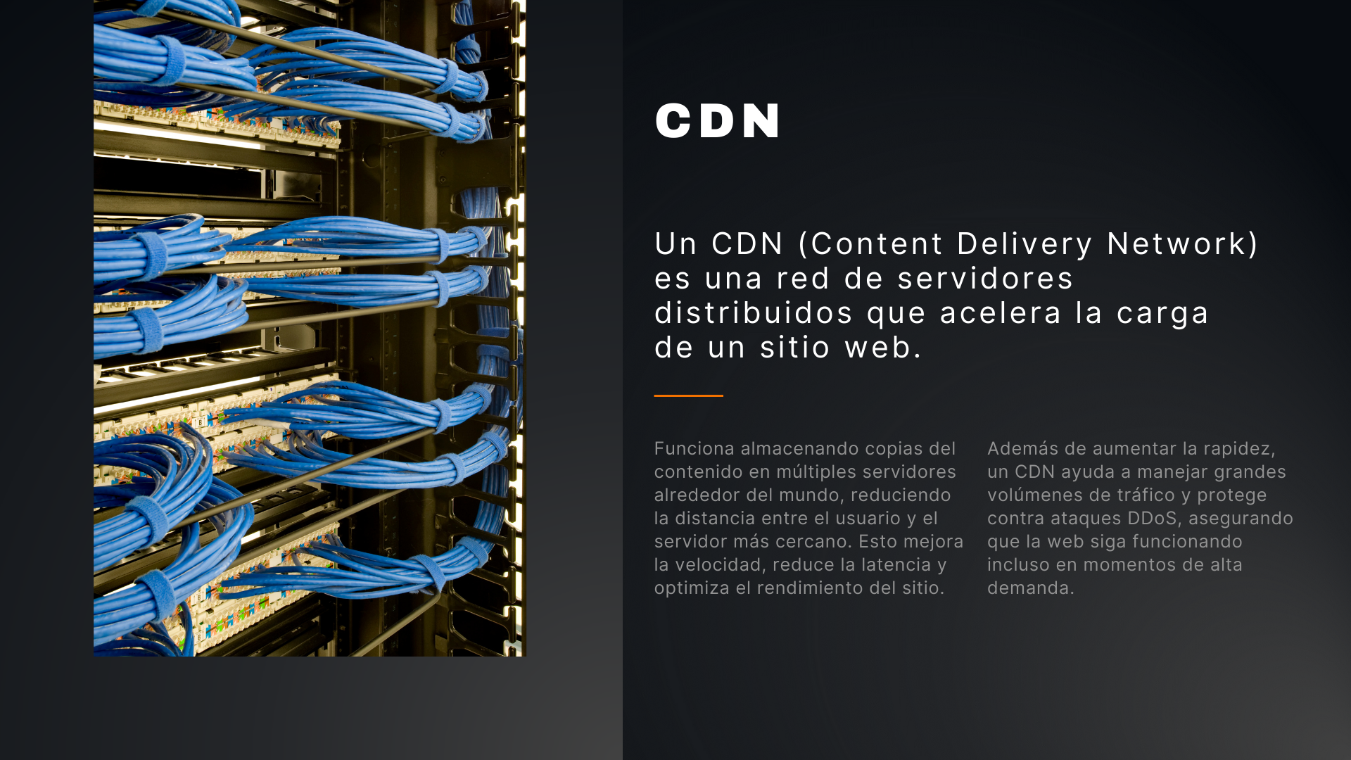 Además de aumentar la rapidez, un CDN ayuda a manejar grandes volúmenes de tráfico y protege contra ataques DDoS, asegurando que la web siga funcionando incluso en momentos de alta demanda.