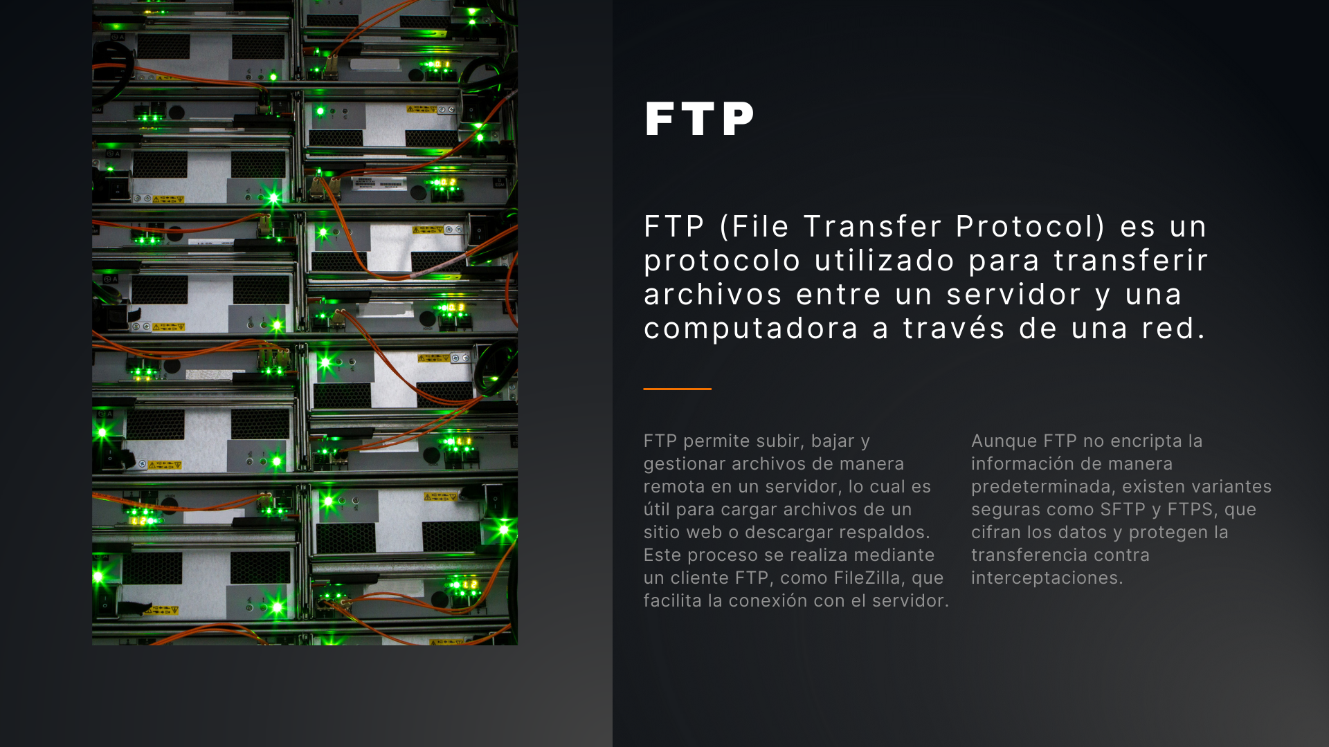 FTP (File Transfer Protocol) es un protocolo utilizado para transferir archivos entre un servidor y una computadora a través de una red.