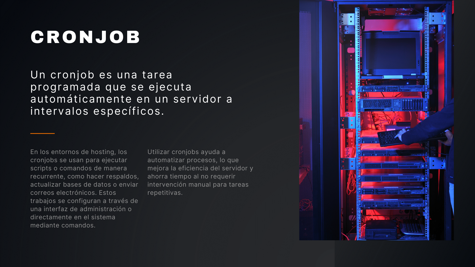 En los entornos de hosting, los cronjobs se usan para ejecutar scripts o comandos de manera recurrente, como hacer respaldos, actualizar bases de datos o enviar correos electrónicos. Estos trabajos se configuran a través de una interfaz de administración o directamente en el sistema mediante comandos.