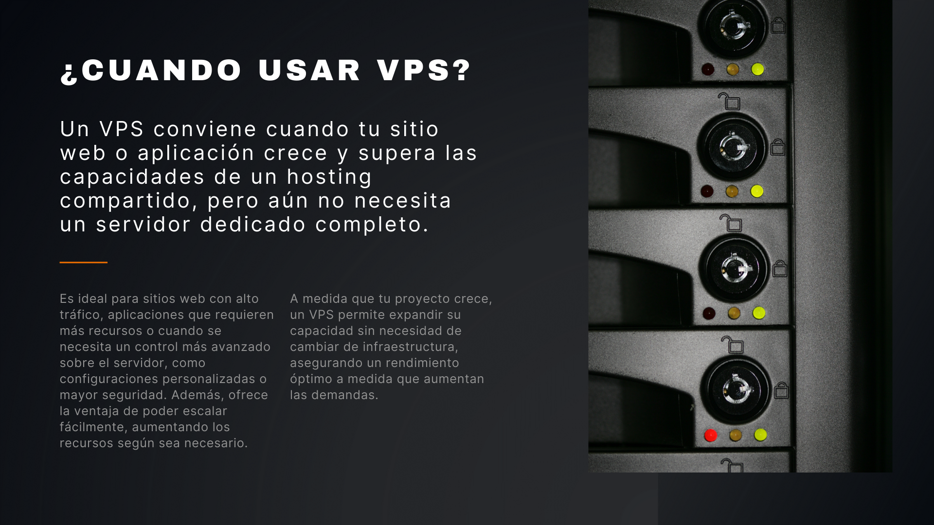 Es ideal para sitios web con alto tráfico, aplicaciones que requieren más recursos o cuando se necesita un control más avanzado sobre el servidor, como configuraciones personalizadas o mayor seguridad. Además, ofrece la ventaja de poder escalar fácilmente, aumentando los recursos según sea necesario.
