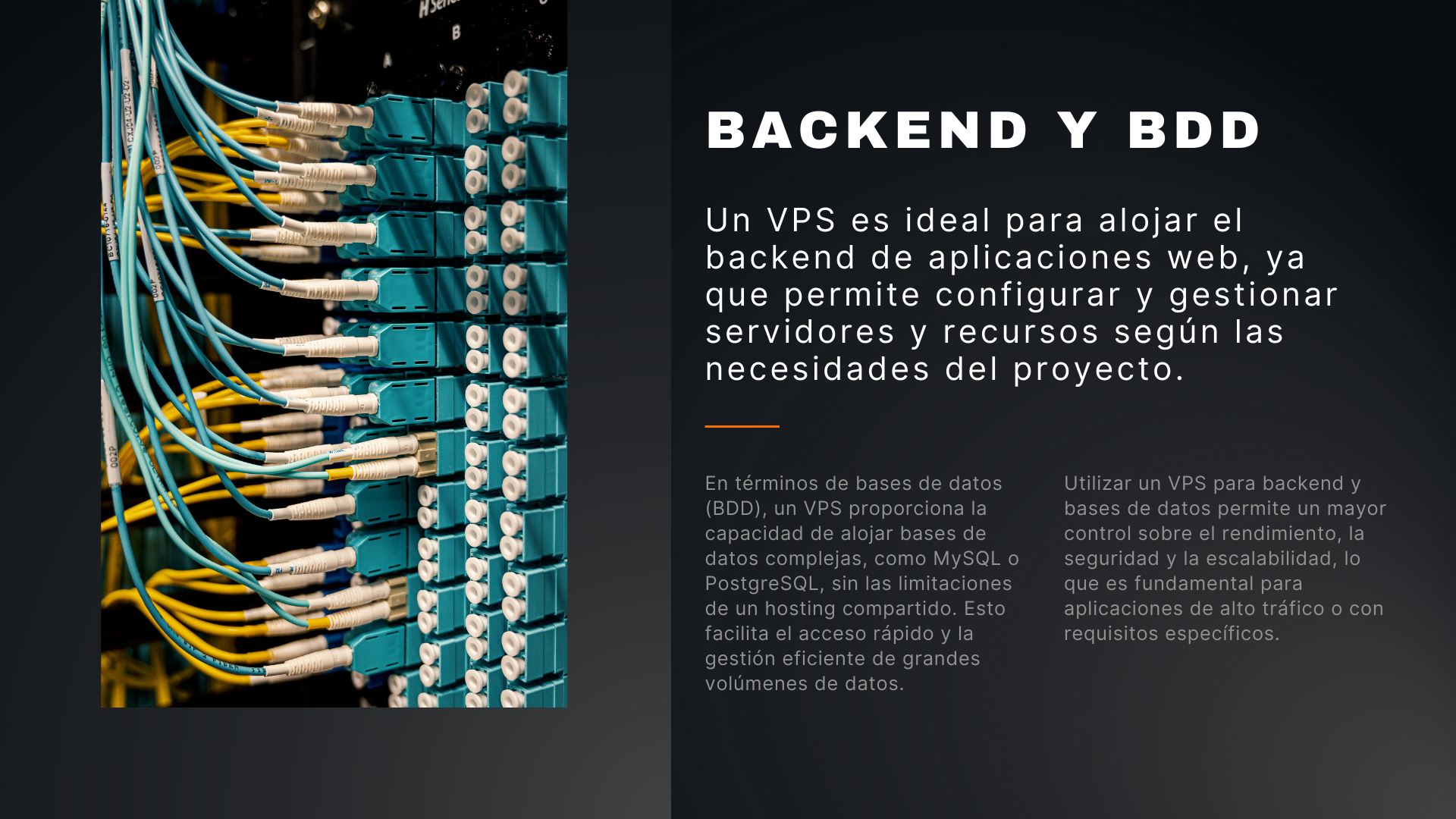 Un VPS es ideal para alojar el backend de aplicaciones web, ya que permite configurar y gestionar servidores y recursos según las necesidades del proyecto.