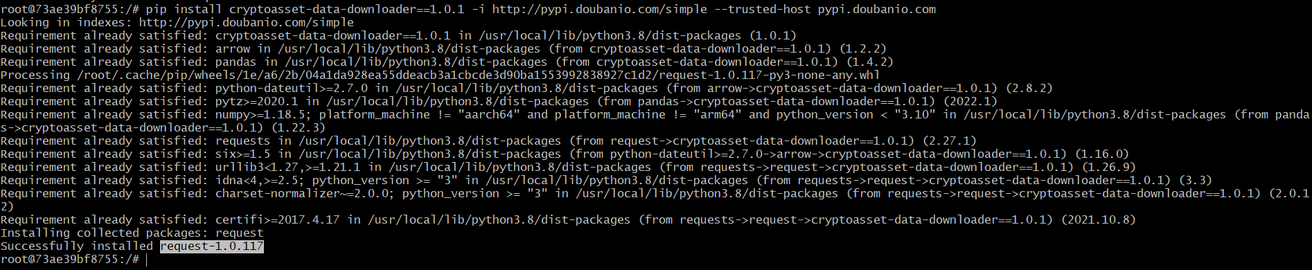 We found a malicious backdoor in versions 1.0.0~1.0.1 of this project, and its malicious backdoor is the request package. Even if the request package was removed by pypi, many mirror sites did not completely delete this package, so it could still be installed.When using pip install cryptoasset-data-downloader==1.0.1 -i http://pypi.doubanio.com/simple --trusted-host pypi.doubanio.com, the request malicious plugin can be successfully installed.