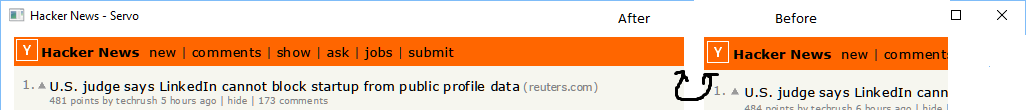 Picked this up again recently. Current WIP handles the example above correctly. https://github.com/adamncasey/servo/tree/feature/cellpadding It turned out that cellspacing is somewhat different to cellpadding since cellpadding is actually applied to the cells in the table, not the table itself. The current implementation looks up the table's cellspacing value when Another possible implementation is to pass some kind of reference down this chain as each object is created. The reference needs to be mutable by the table, as this property can be updated. This would probably increase memory by a few bytes per table section/row/cell with the benefit that each time this HN Top bar after/before patch: Aiming to put in PR in the next few days |