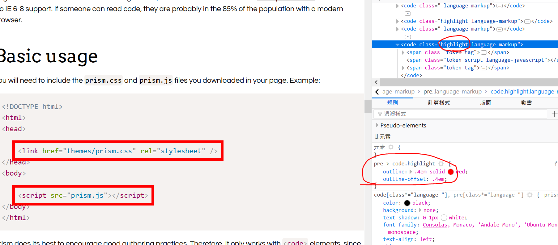 Basic Usagesection and check the red outline in the code blockIn Firefox Nightly: