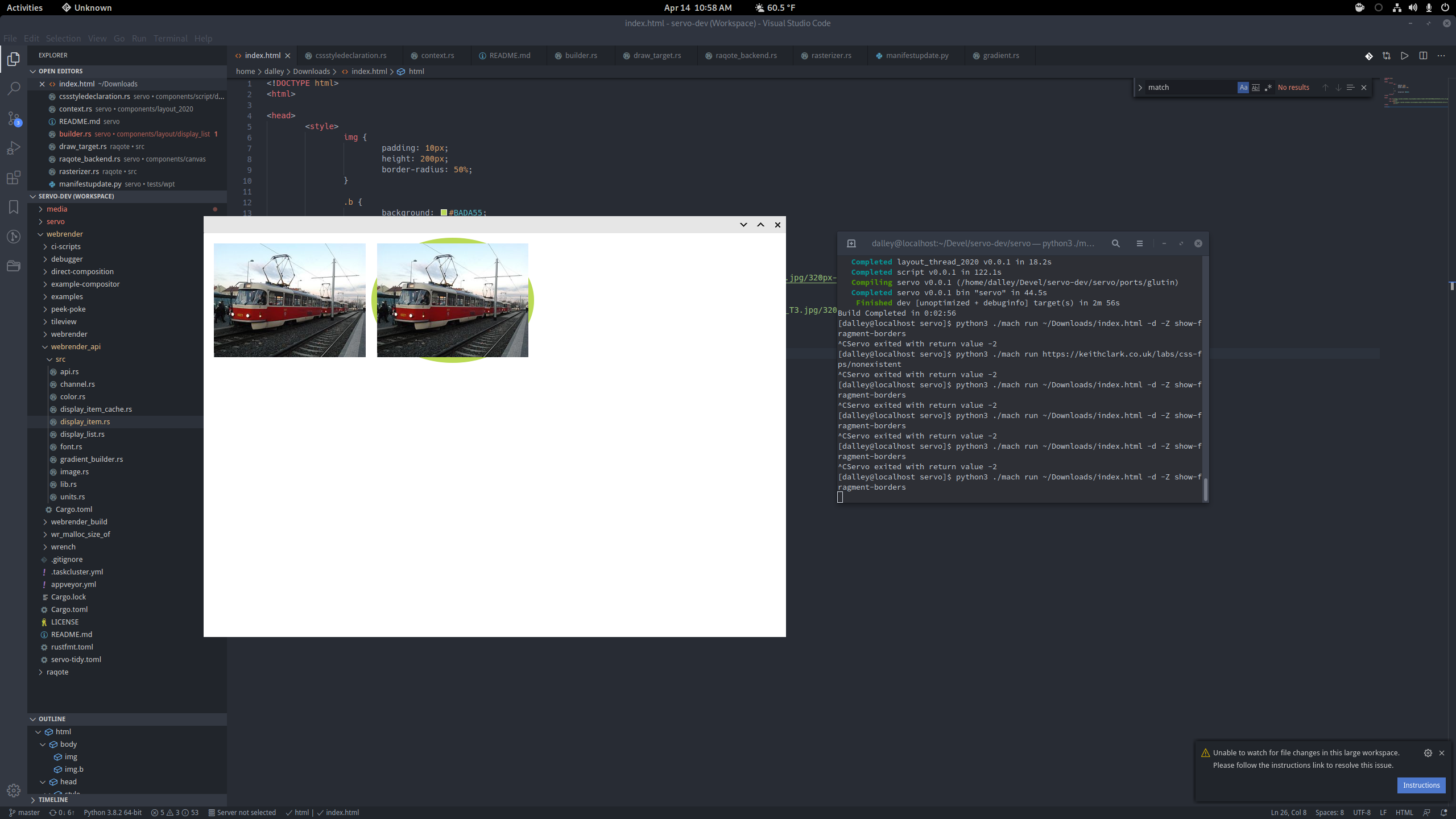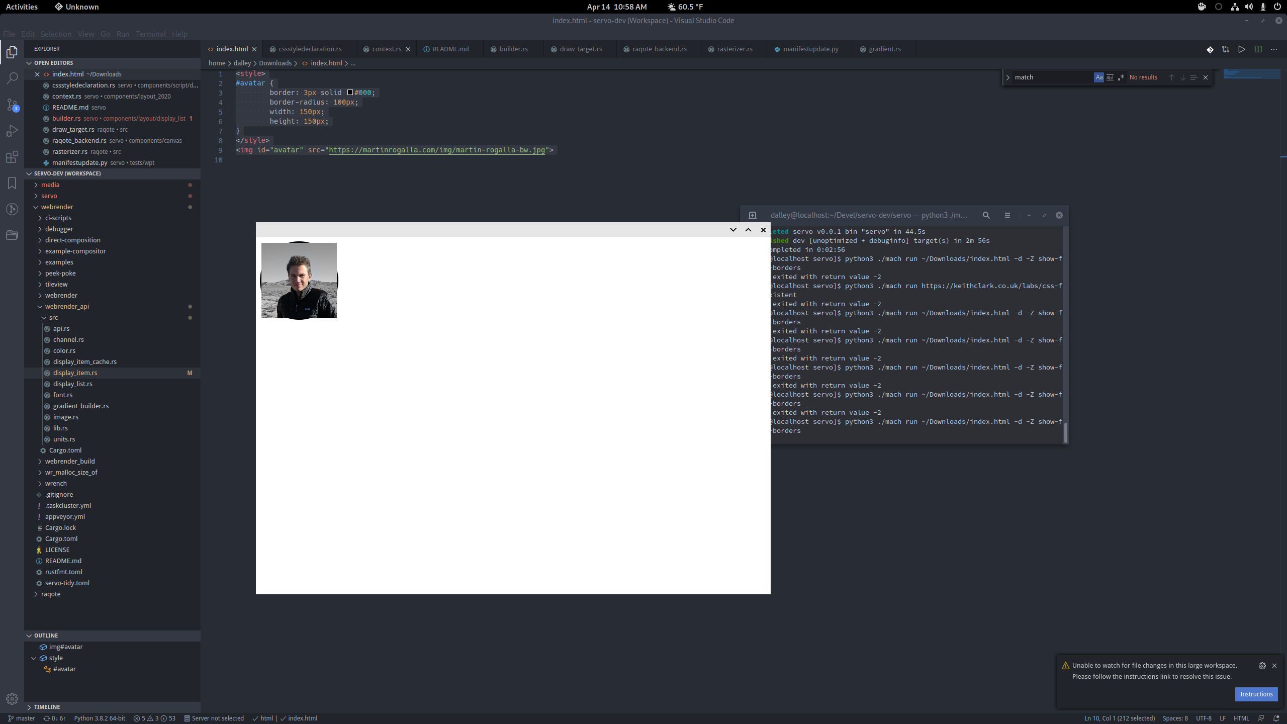 Ignore #20922 (comment), I'm wrong, it's definitely drawing a round border and then drawing the rectangular image on top of that. It's obvious if you toss a panic in before the image gets drawn. All the dimensions are correct when I measure with GIMP (as far as I know, I have very little web dev experience). It seems like the image stops drawing at the outer edge of the border rather than the inner edge, or it's on top when it should not be. I assume the issue is probably somewhere in here? https://github.com/servo/servo/blob/master/components/layout/display_list/builder.rs#L1720 |