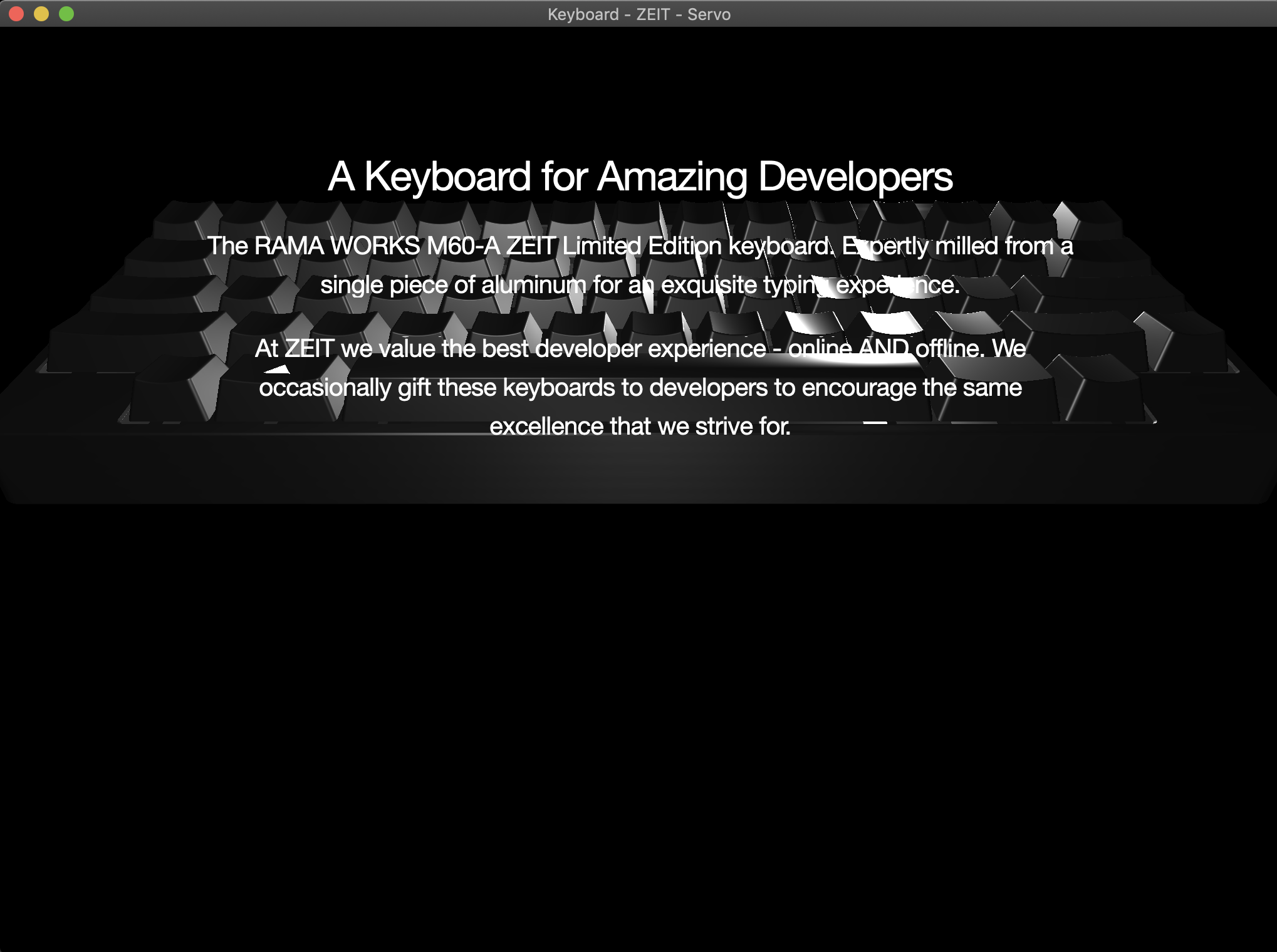 I tried loading https://zeit.co/keyboard in Windows 10 and it didn't work. I didn't realize the keyboard was rendered with WebGL at first. Is that error sidebar new? I tried clicking on it but it just flickered in and out. Edit: This is part of the web page, not Servo. |