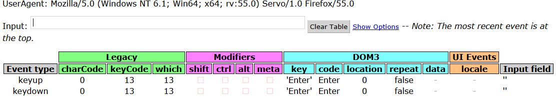 windowto consider ENTER key as non-printable, let document does not appends redundant carriage return when press enter on textinput field. But this PR instead omitskeypressevent onEnterlikewhile other browsers does emit