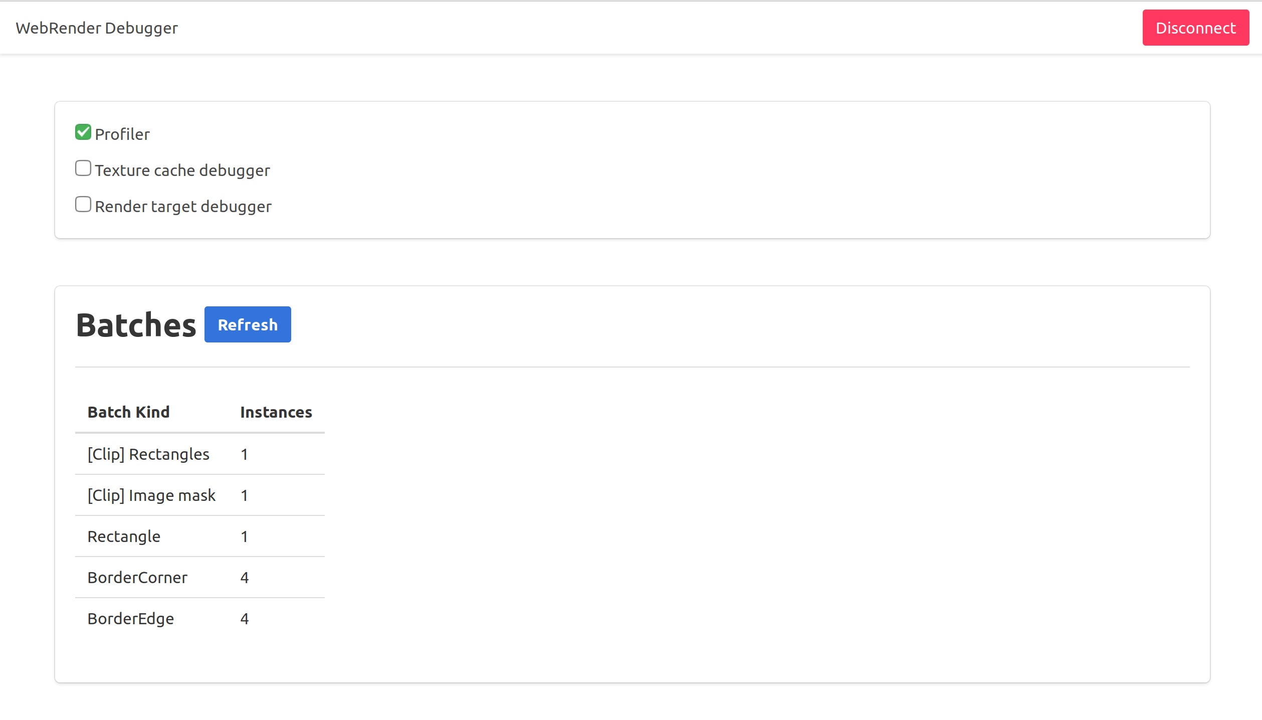 The initial implementation allows toggling the debug flags (e.g. profiler, texture cache debug view) and dumping a list of draw call batches to the browser.