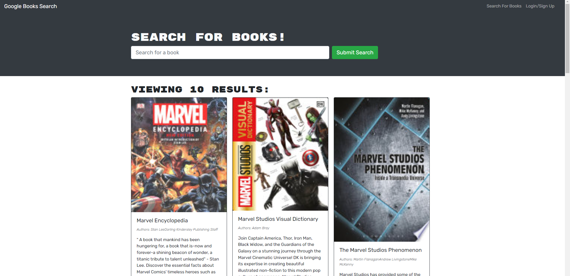THEN I am presented with several search results, each featuring a book’s title, author, description, image, and a link to that book on the Google Books site and a button to save a book to my account