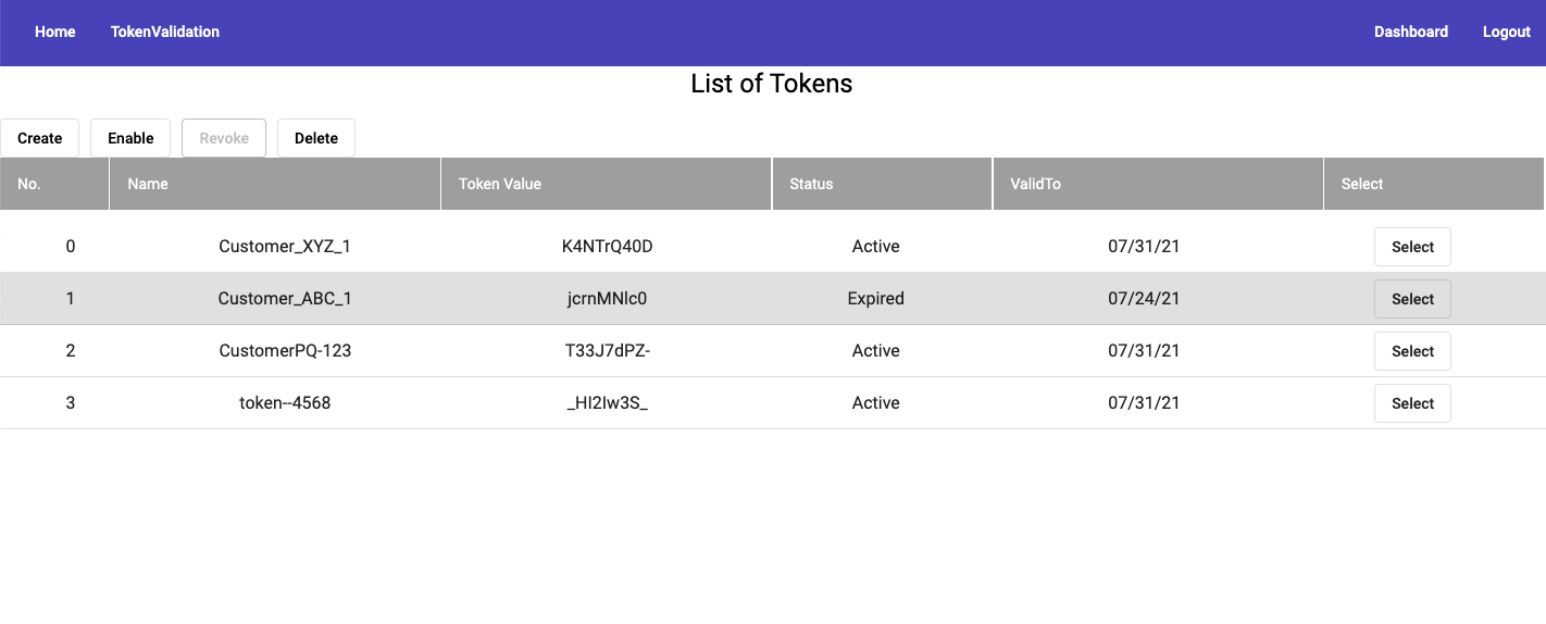 Admin can select a token by clicking 'Select' button and enable, revoke or delete it.