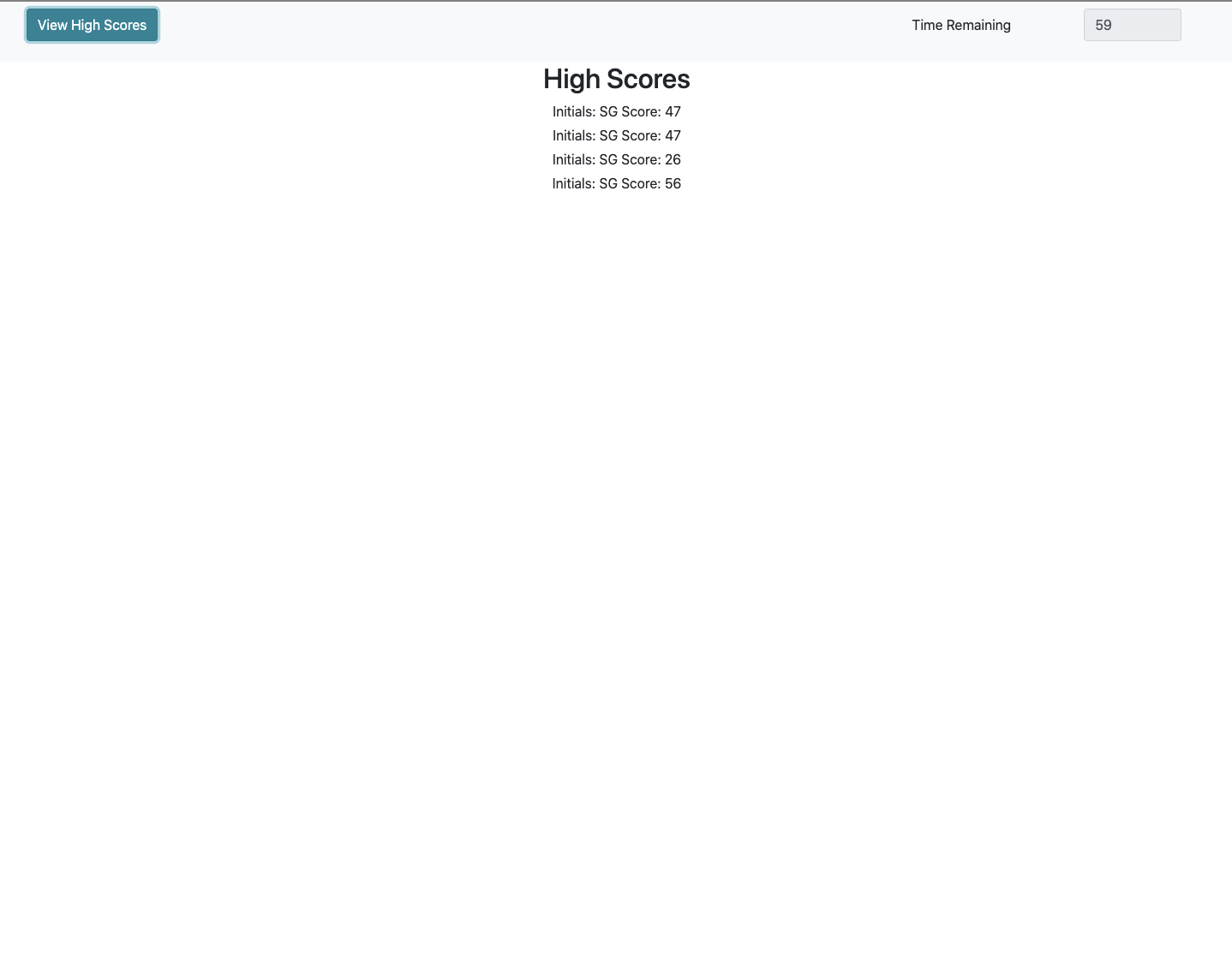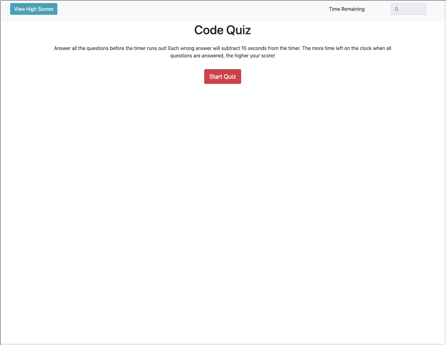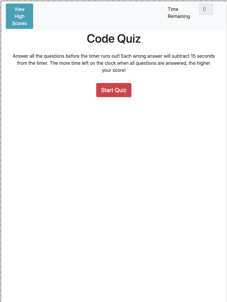 The "Coding Quiz" is a timed coding quiz with multiple choice questions. If you answer a questions incorrectly, then time is subtracted from the timer. When all quetsions are answered, or the timer reacher 0, then the game is over and you are able to save your score and ititials.