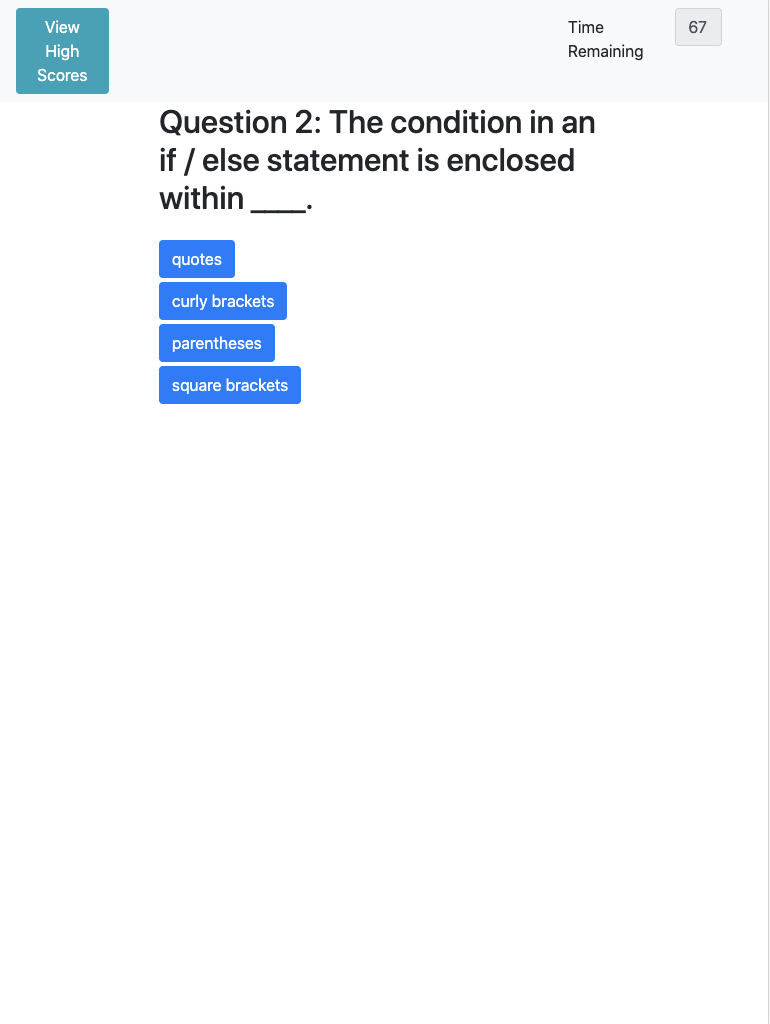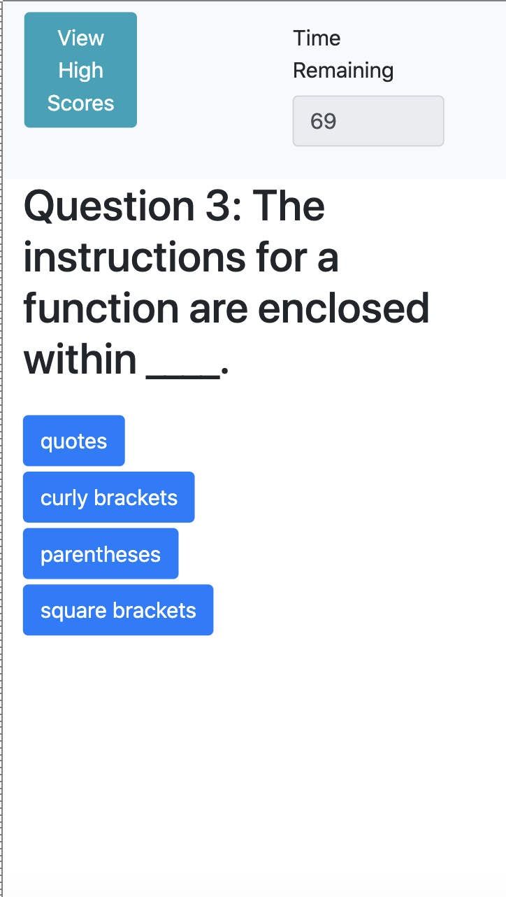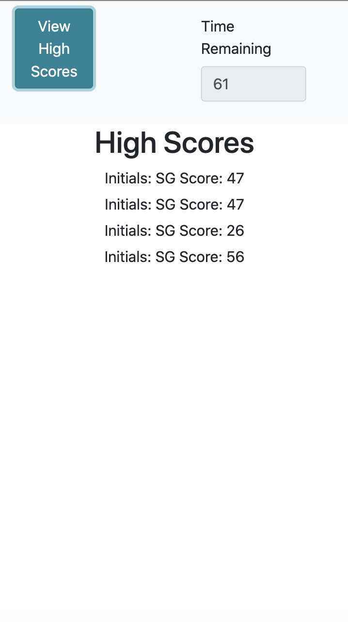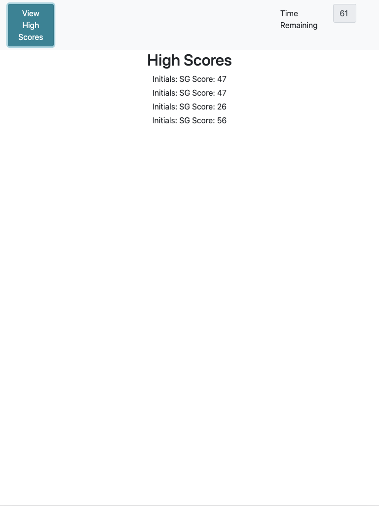 The "Coding Quiz" is a timed coding quiz with multiple choice questions. If you answer a questions incorrectly, then time is subtracted from the timer. When all quetsions are answered, or the timer reacher 0, then the game is over and you are able to save your score and ititials.