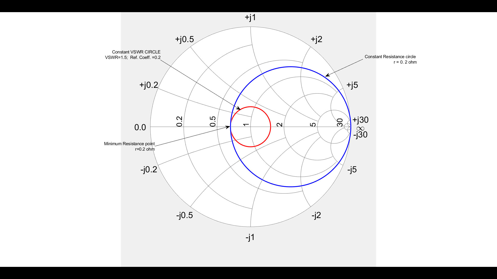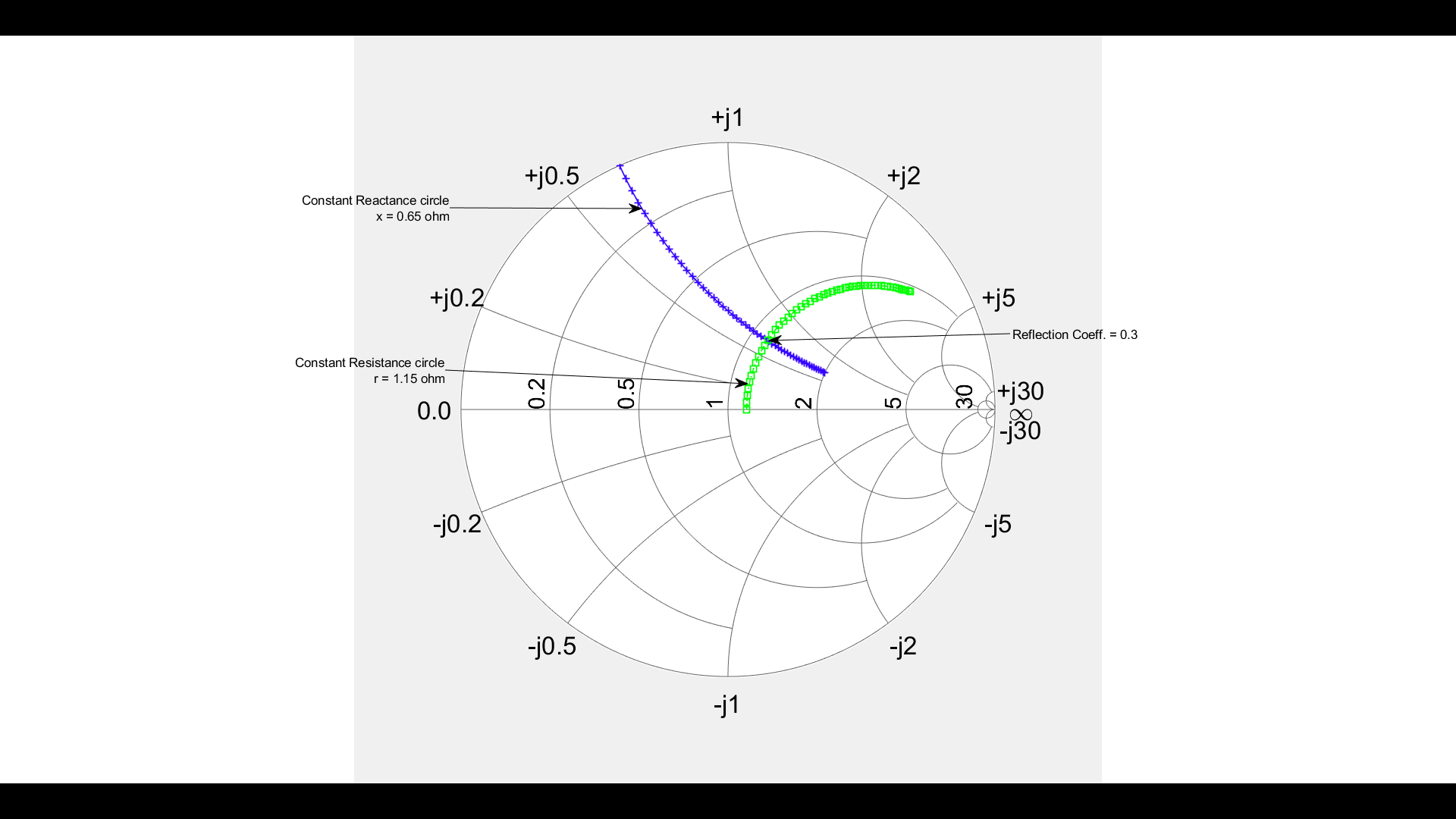 MATLAB SMITH CHART showing Constant resistance circle and constant reactance circle Showing Constant VSWR circle and constant resistance circle intersection to get minimum impedance point for given VSWR Or Reflection Coeff.