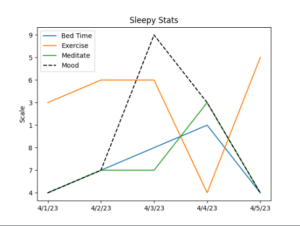 With this application, you can put in your Sleepy Stats which will allow you to see correlations between your daily activity goals you've set for yourself and how they relate to your general mood. Seeing this visualization will empower users to take control of their habits and live more proactively. The application output is a graph you can save to your desktop. Created for the hackathon AutumnHacks.
