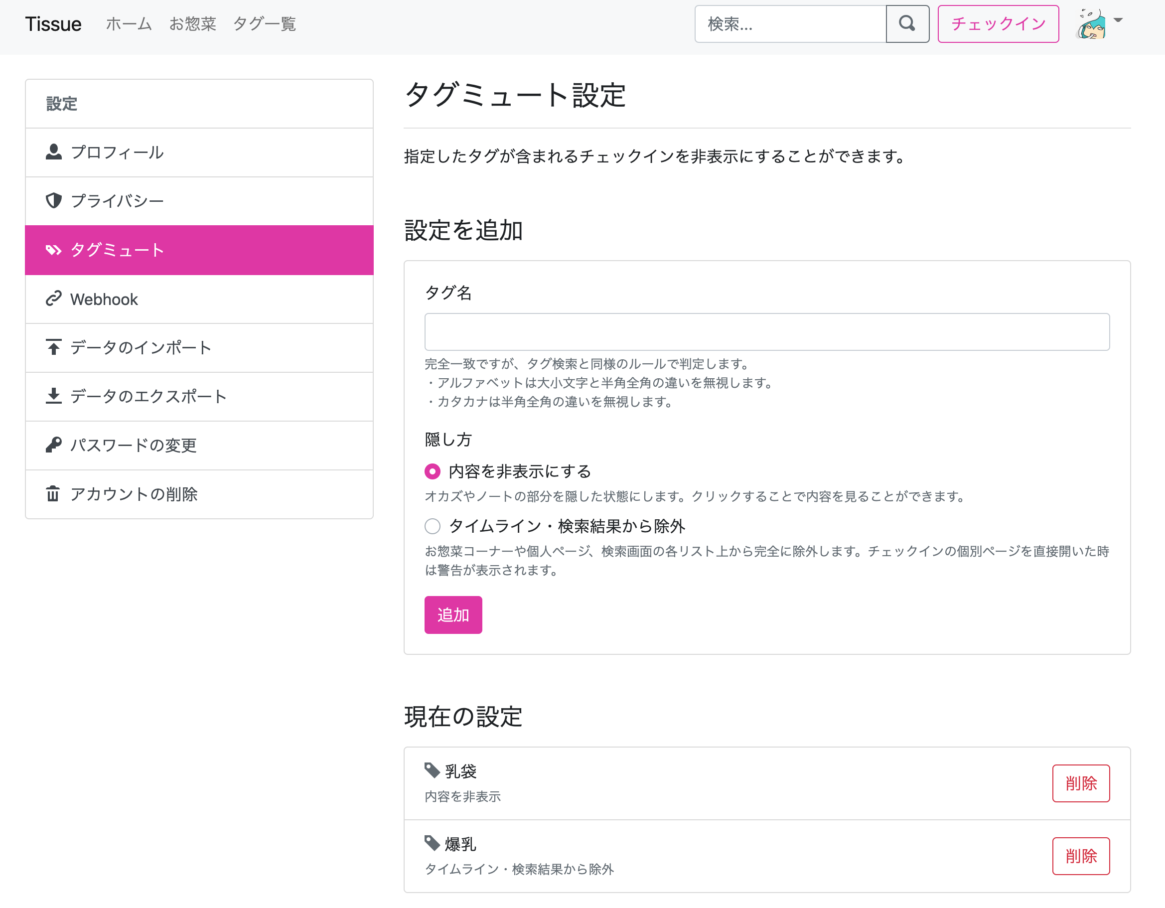 こんな感じの画面を追加して、タグをキーとしたミュート(フィルタリング)を行えるようにします。