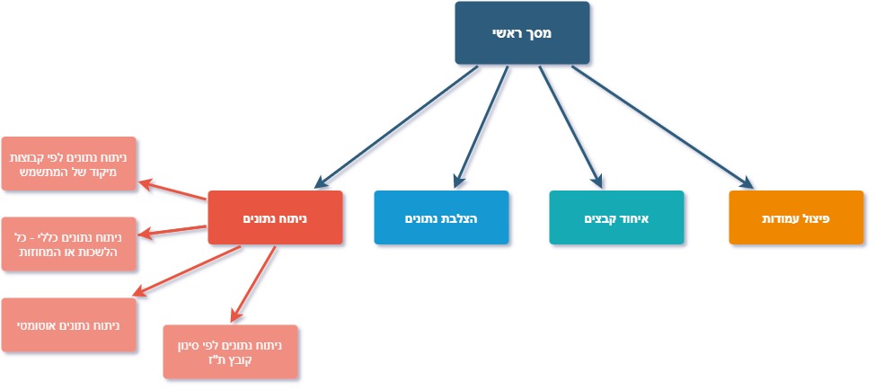 Data analysis according to the employment service format - with focus groups for user requirement or without, data analysis according to automatic format created from the input file structure (Excel file), data analysis according to the employment service format for all bureaus in the Southern District or for all Israeli employment service districts. In addition, there is the option of filtering by a focus group that consists of a list of IDs only.