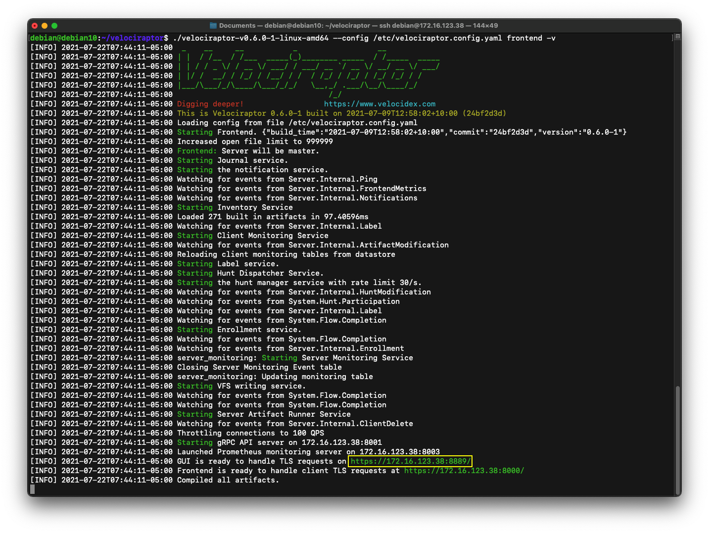 ./velociraptor-v0.6.0-1-linux-amd64 --config /etc/velociraptor.config.yaml frontend -v
