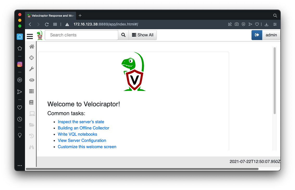 $ velociraptor guiThis will bring up the GUI, Frontend and a local client. You can collect artifacts from the client (which is just running on your own machine) as normal.