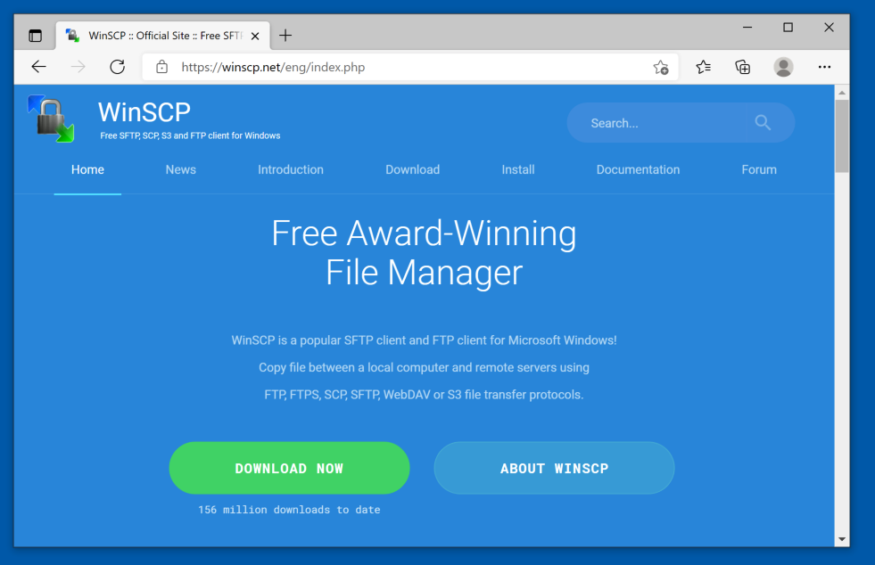 Installing the Windows Client On your Windows machine, in a Web browser, go to https://winscp.net/eng/index.php Download and install WinSCP, as shown below.