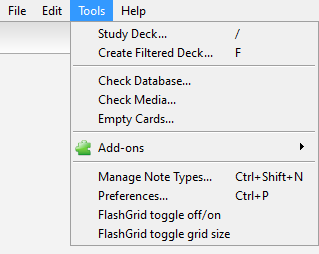 TIP: Whichever method you use, make sure your card's back doesn't include info from the front, since that would give away the answer when using FlashGrid. Since quite a few decks do include the front as the first part of the back--usually followed by a horizontal line--FlashGrid attempts to not display any data found on the card back, up to and including the first <HR> tag (horizontal rule). If no <HR> is found, the whole card back will be displayed.