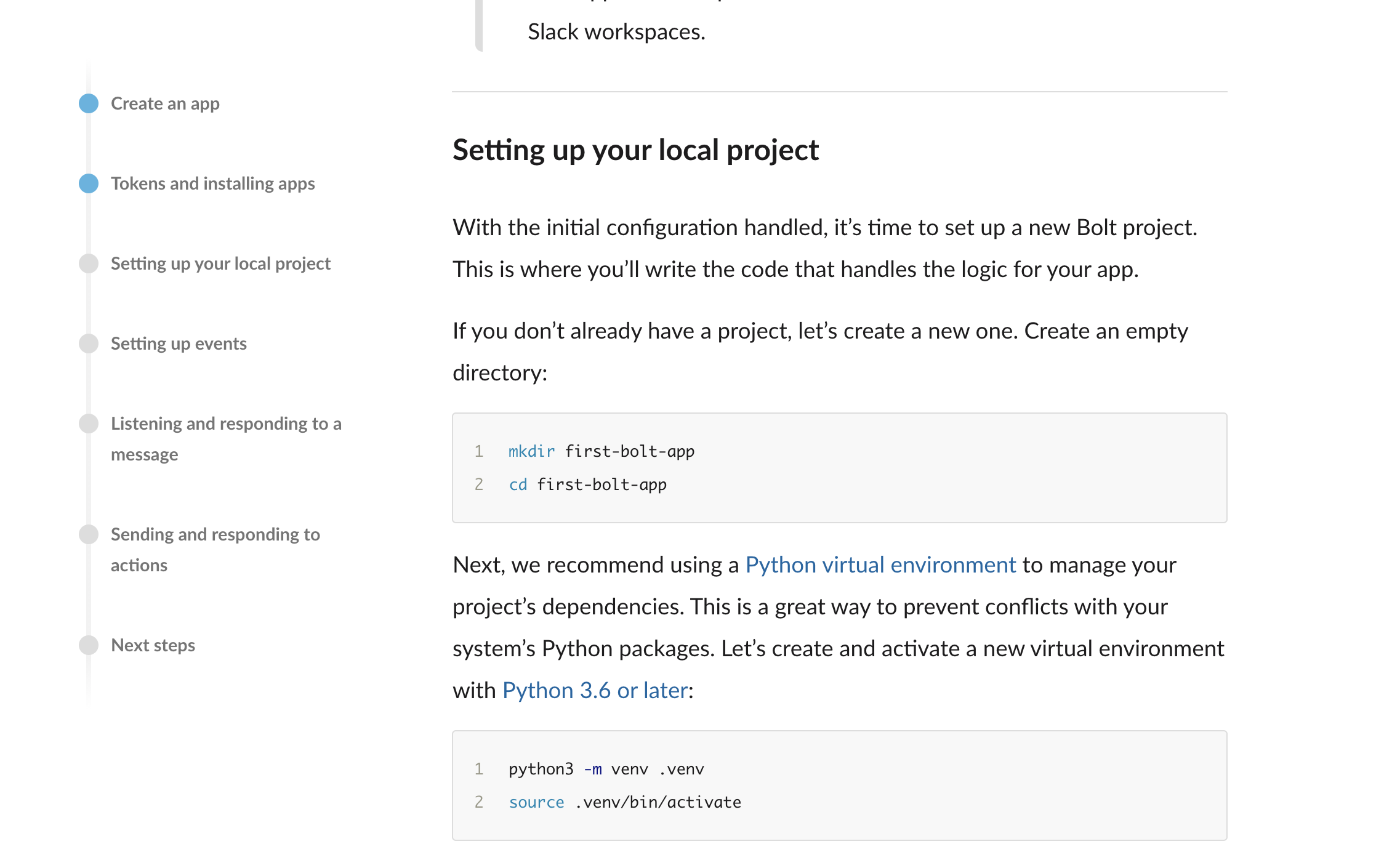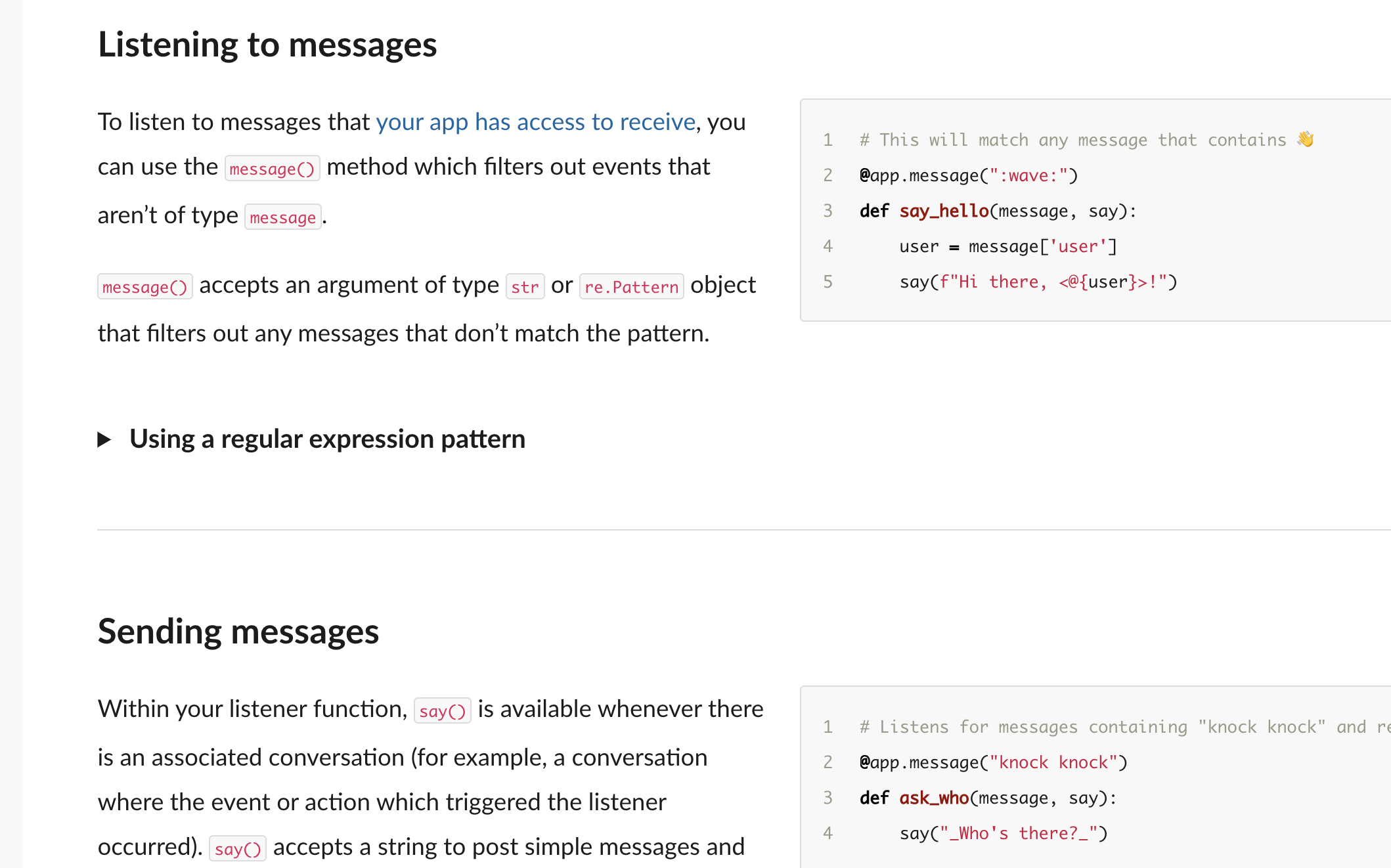 | Typically you'd call `ack()` as the first step of your listener functions. Calling `ack()` tells Slack that you've received the event and are handling it in within reasonable amount of time (3 seconds). | ||