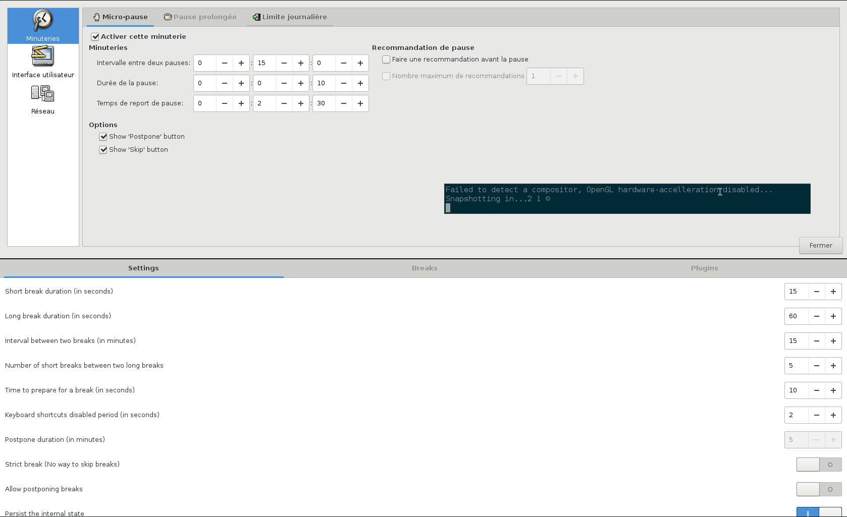 Hi @anarcat, May I know how workrave handles clashing short and long breaks? I hope it should be long break. Further, if I set short breaks every 14 minutes and long breaks every 57 minutes, will I get a long break(at 57th minute) after a 1-minute delay from fourth short break (at 56th minute)? |