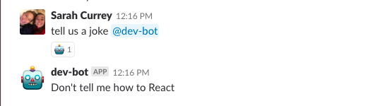 For my first slackbot, I decided to create a Dev-Bot, a slack bot that would send you dev jokes when bugs make you sad.