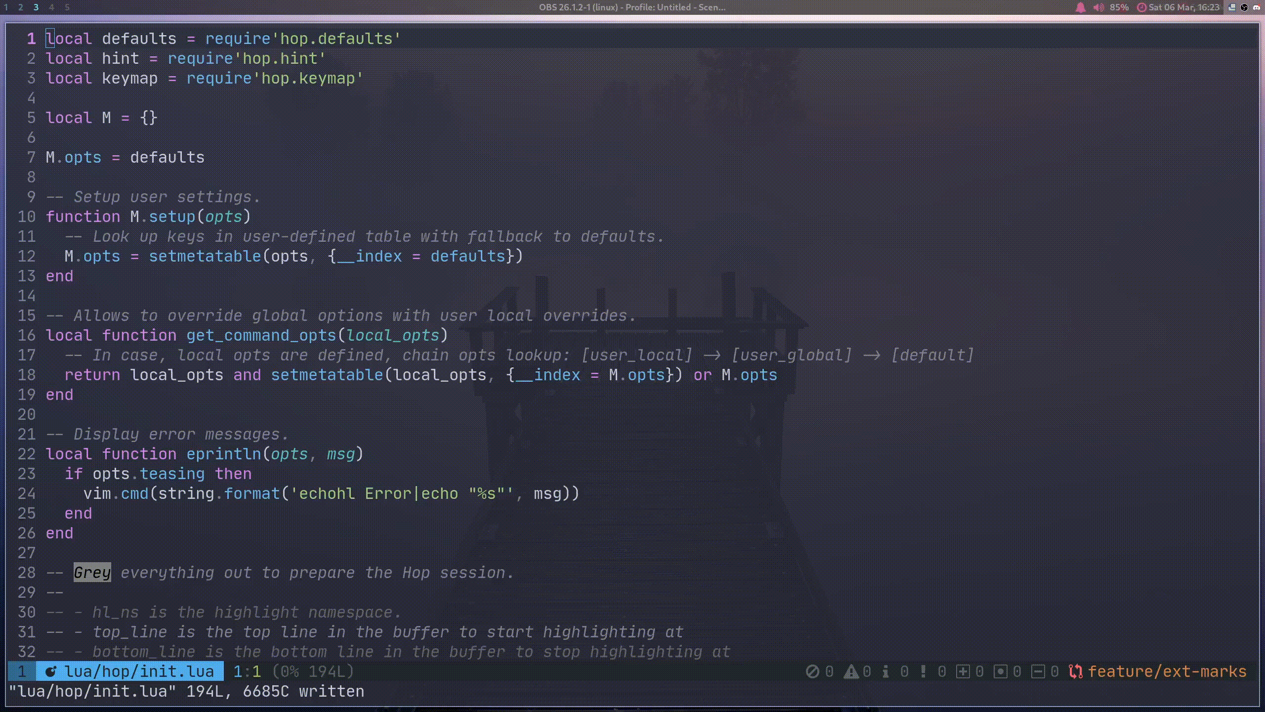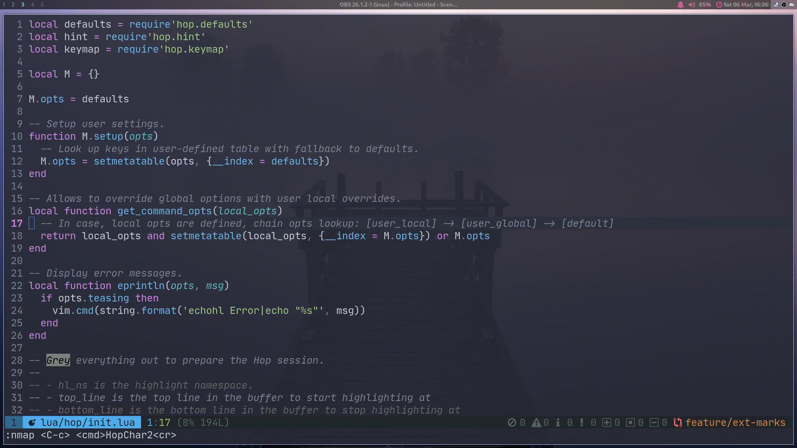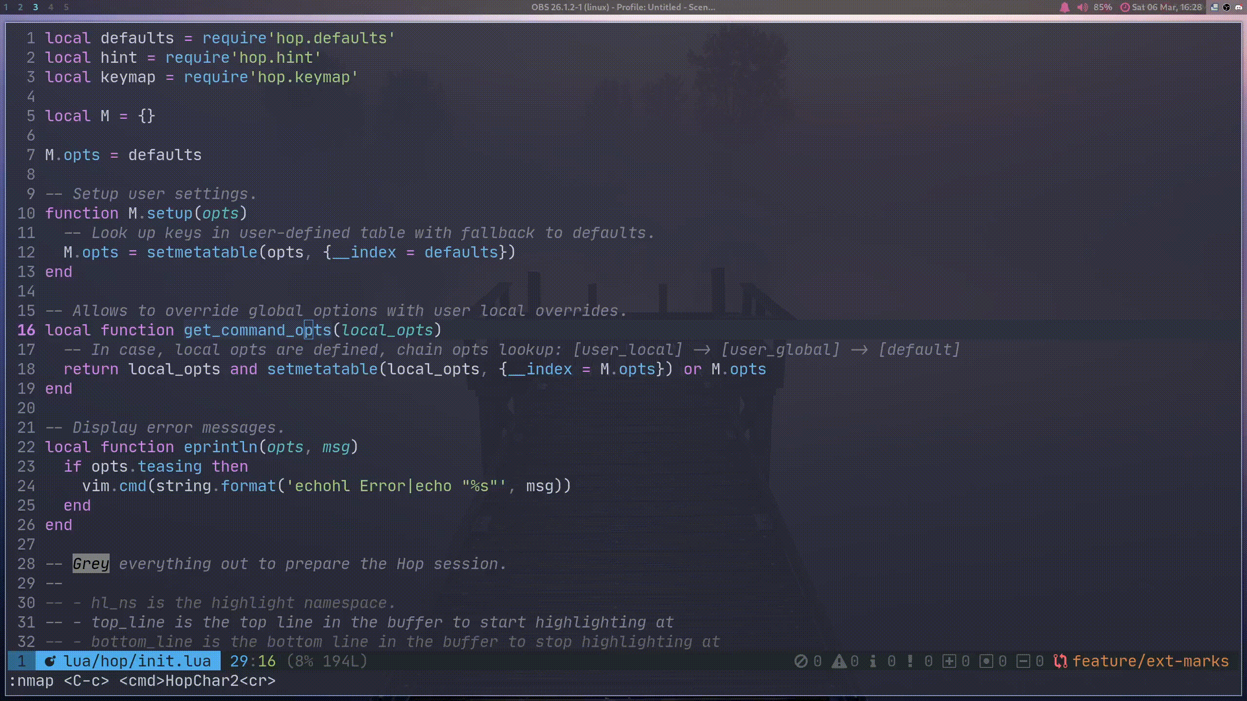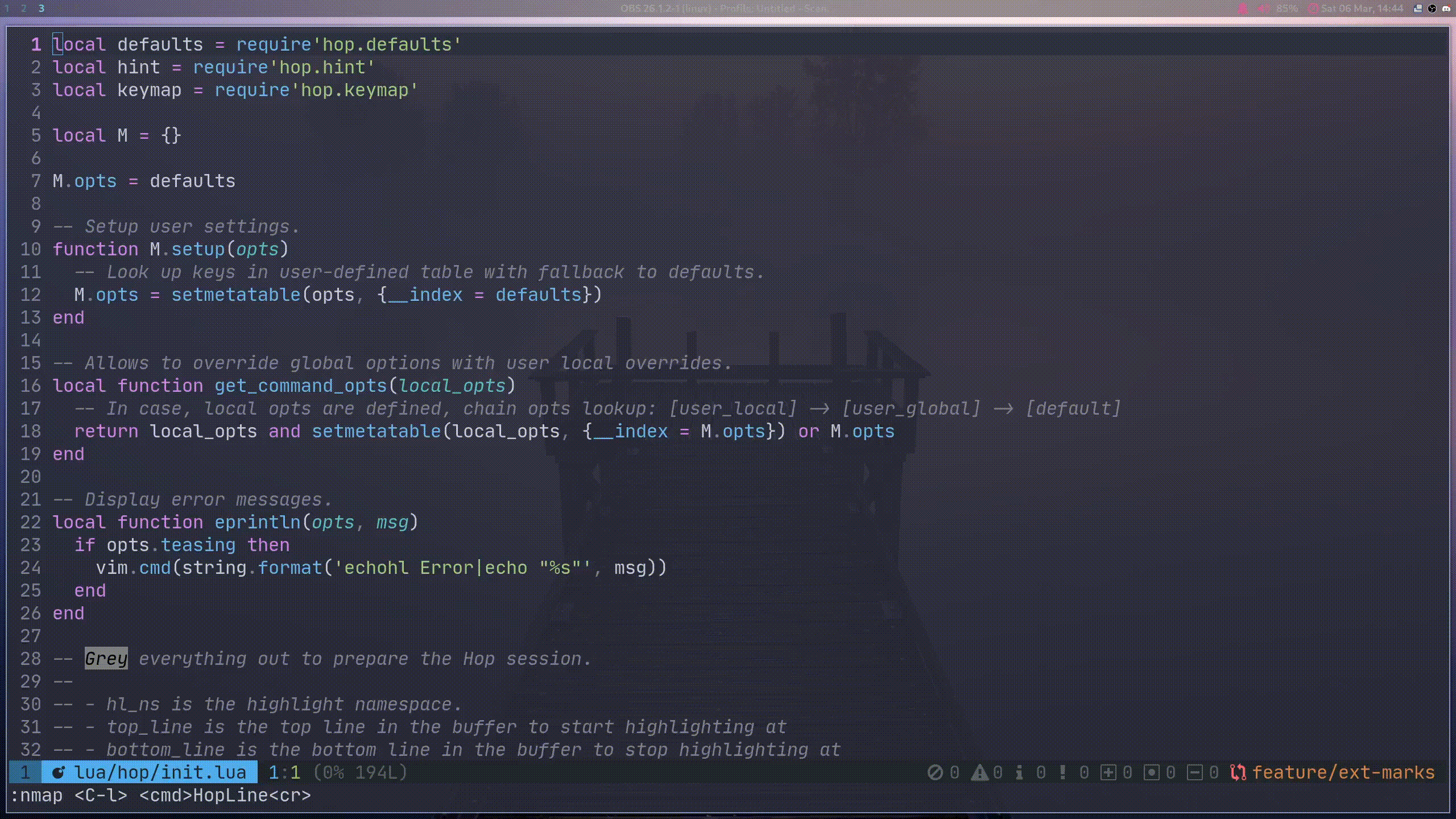 Plug 'phaazon/hop.nvim', { 'branch': 'pre-extmarks' }Keep in mind that this branch is provided as-is until Neovim bugs are fixed regarding extended marks (if any). I don’t plan on maintaining this branch and it should be short-living.