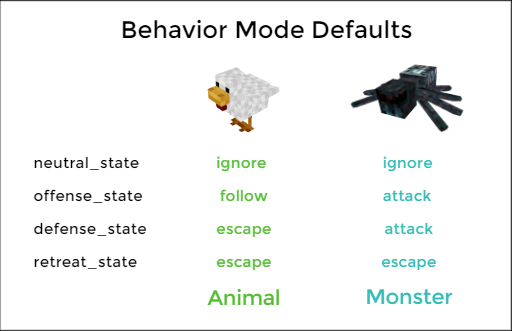 The alerted behavior of a mob after acquiring a target is determined by itsoffense_state property. For monsters this will typically be attack, whereas for animals it may be either escape or follow.
