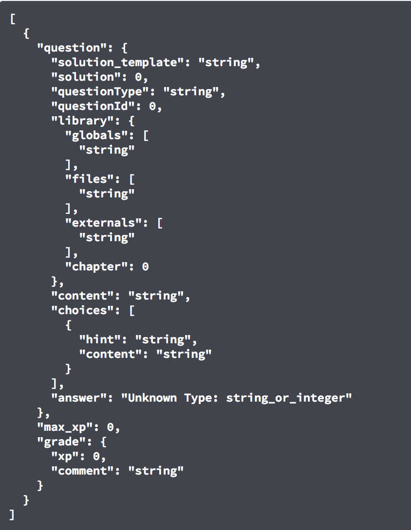 | summary("Get questions contained inside a mission. Response is either `mcq` or `programming`") |