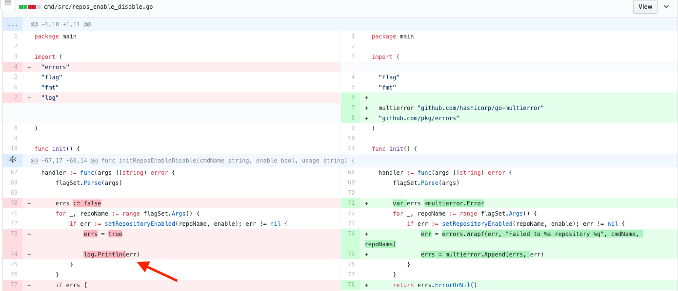 sourcegraph/src-cli@bd3f073#diff-209313ebbe93f08471dc927fd86dd079 (notice how the line 74 in the diff is actually shorter in the previous commit)