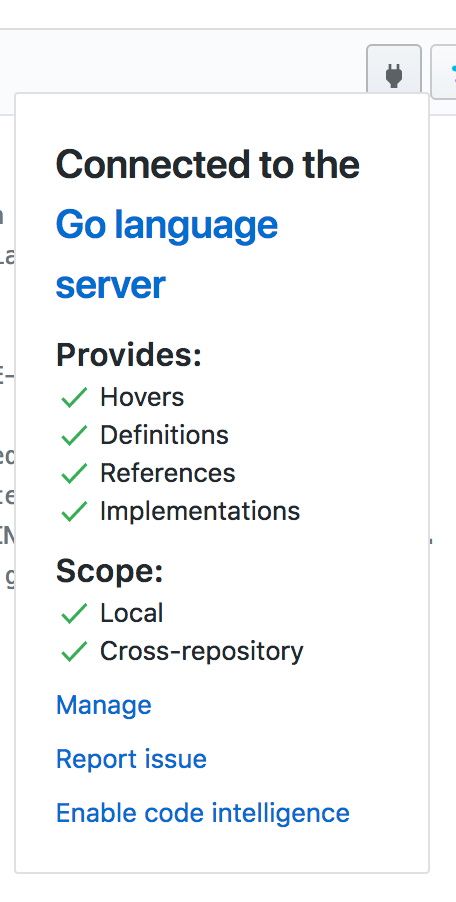 Browser extension indicator is black, but Go language server is connected (hover tooltips error for this particular file, but I filed a separate issue).