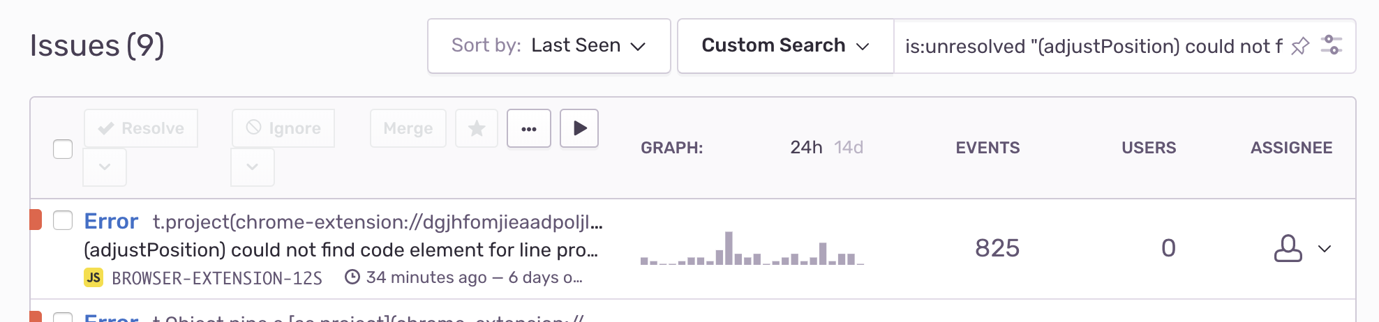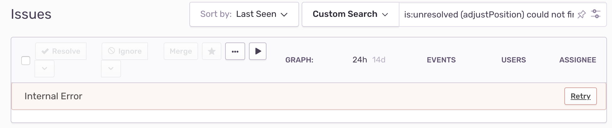 The following would work on Sentry (with the query wrapped in quotes): https://sentry.io/organizations/sourcegraph/issues/?project=1334031&query=is%3Aunresolved+%22%28adjustPosition%29+could+not+find+code+element+for+line+provided%22&statsPeriod=14d