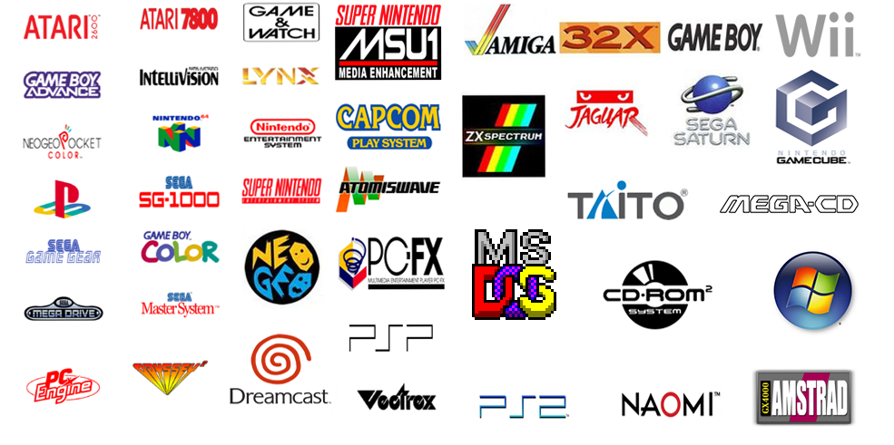3DO - ARCADE (MAME, FBA) - ATARI 2600 - ATARI 5200 - ATARI 7800 PRO SYSTEM - ATARI ST - ATOMISWAVE - DREAMCAST - GAMEBOY - GAMEBOY ADVANCE - GAMEBOY COLOR - GAMECUBE - GAMEGEAR - JAGUAR - LYNX - MASTER SYSTEM - MEGA-CD - MEGADRIVE (GENESIS) - DOS - NAOMI - NEO-GEO - NEO-GEO CD - NEO-GEO POCKET - NEO-GEO POCKET COLOR - FAMICOM (NES) - NINTENDO 64 - NINTENDO DS - ODYSSEY² (VIDEOPAC) - PC-ENGINE - PC-ENGINE CD - PLAYSTATION - PLAYSTATION 2 - PLAYSTATION 3 - PSP - SATURN - SEGA 32X - SUPER FAMICOM (SUPER NES) - SUPER NES MSU-1 - WII - WII U - WINDOWS - WONDERSWAN - WONDERSWAN COLOR -