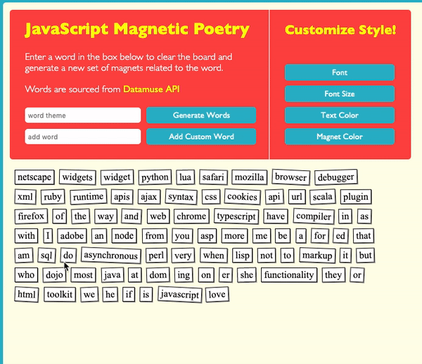 JSMagneticPoetry is a web implementation of Magnetic Poetry fridge magnets. It is fully customizable. Users can create custom word lists inspired by an input word, sourced via Datamuse API.