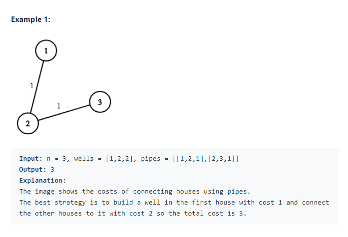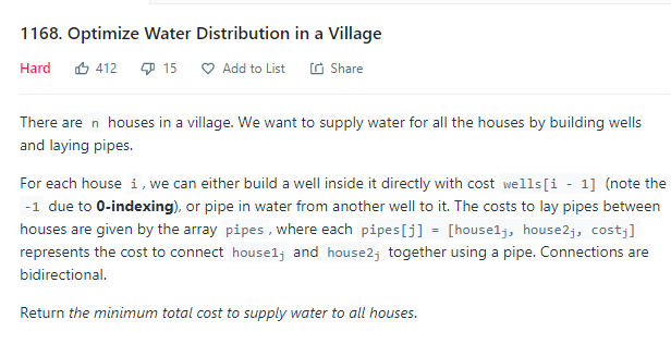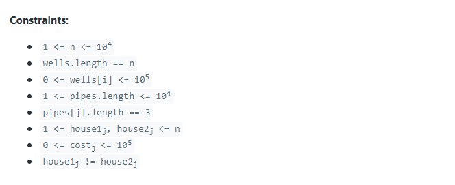 https://leetcode.com/problems/optimize-water-distribution-in-a-village/ Varsayılan kod: ``` class Solution { public int minCostToSupplyWater(int n, int[] wells, int[][] pipes) { } } ```