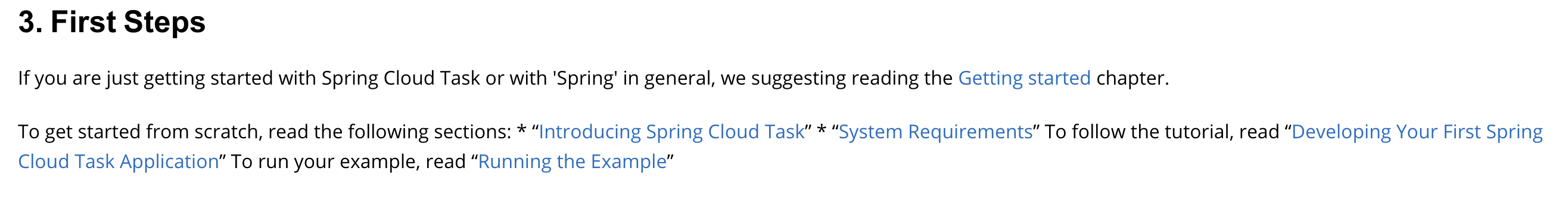 In the reference docs under `3. First Steps` the AsciiDoc formatting is off. https://docs.spring.io/spring-cloud-task/docs/2.3.0-M1/reference/#task-documentation-first-steps