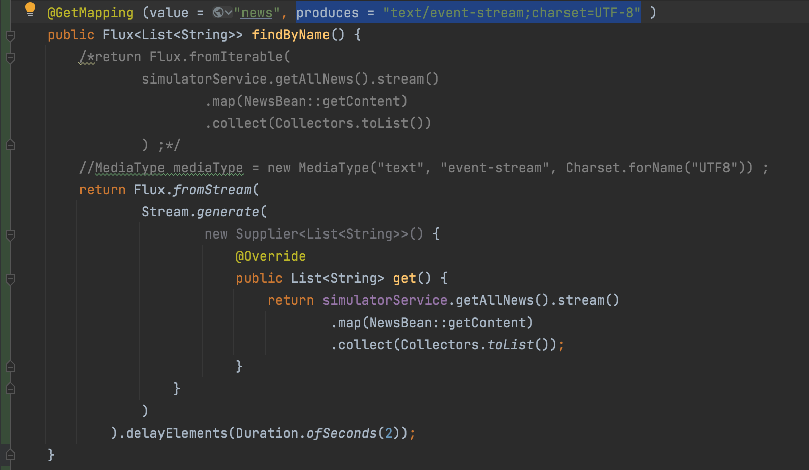 I try to set produces = "text/event-stream;charset=UTF-8", but useless.