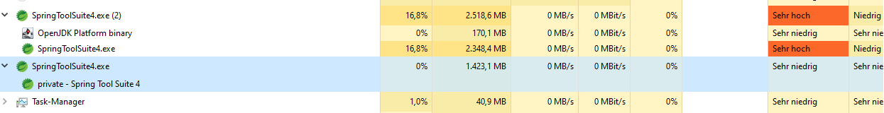 The SpringToolSuite4.exe (2) is the IDE using the workspace with the 83 projects, the SpringToolSuite4.exe is the IDE using the workspace with a handful of projects.