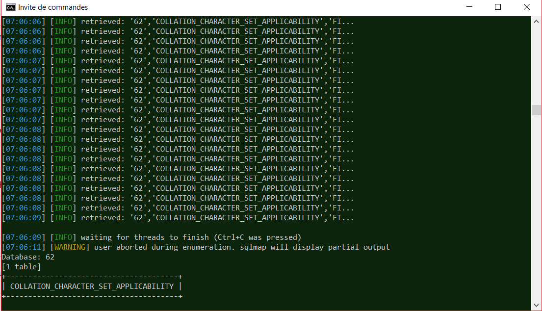 [07:06:05] [INFO] retrieved: '62','COLLATION_CHARACTER_SET_APPLICABILITY'