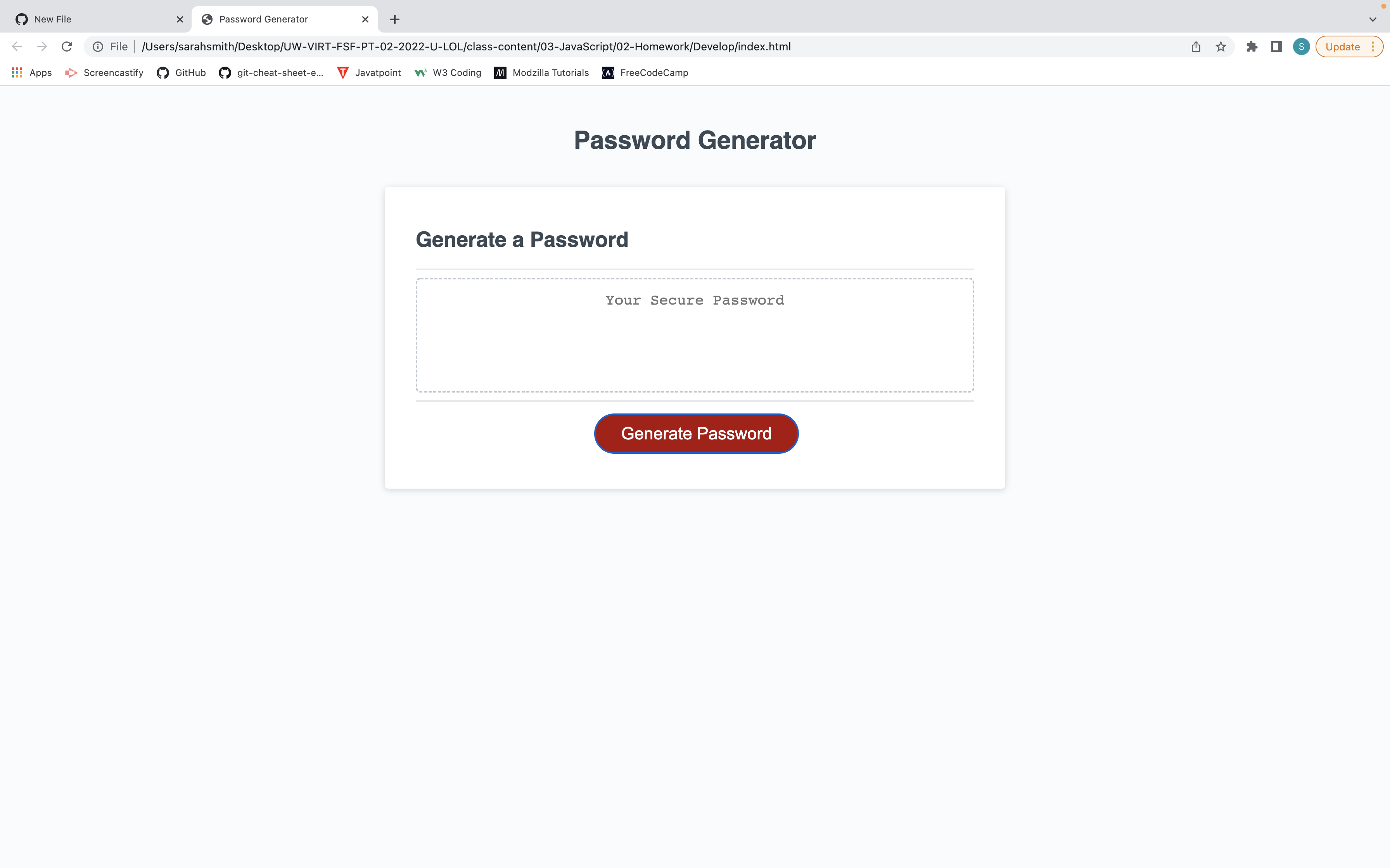 Here I have created a javascript prompt based random password generator. Utilizing the prompt, confirm, and alert windows within Javascript I have created an intuative selection process to create a unique password based on the needs of the user.
