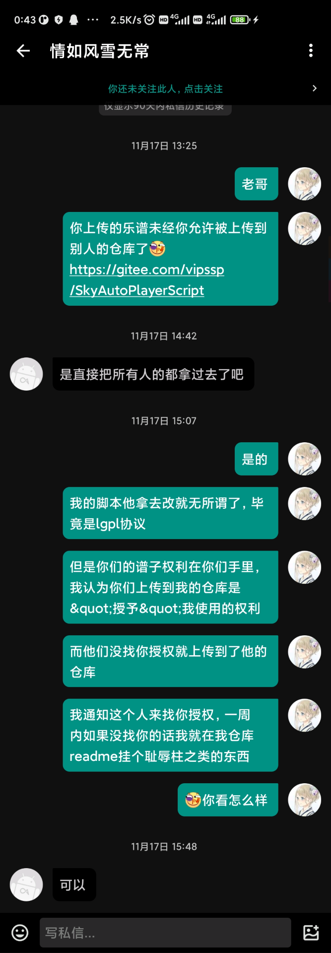 Gitee 用户嗨游圈(@vipssp)在未经乐谱上传者的同意下私自盗用 SkyAutoplayerScript 于 Gitee 的同步镜像到它的 Gitee 仓库。