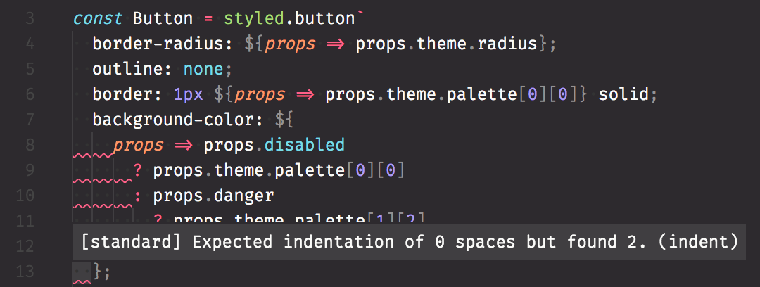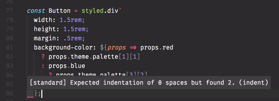 11.0.0-beta.0started to experience weird indentation errors in CSS-in-JS (template literals) syntax. See screenshots attached.If I set indentation how it wants me to, it gets really weird: