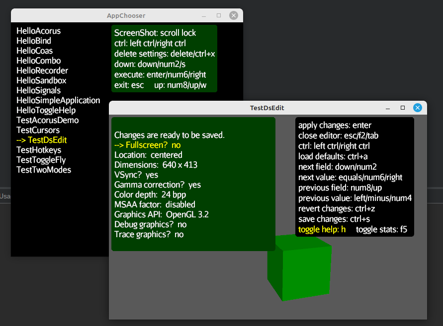 Acorus is oriented toward keyboard-driven demo/test applications. Examples may be found in the Heart, Minie, MonkeyWrench, and Wes projects.