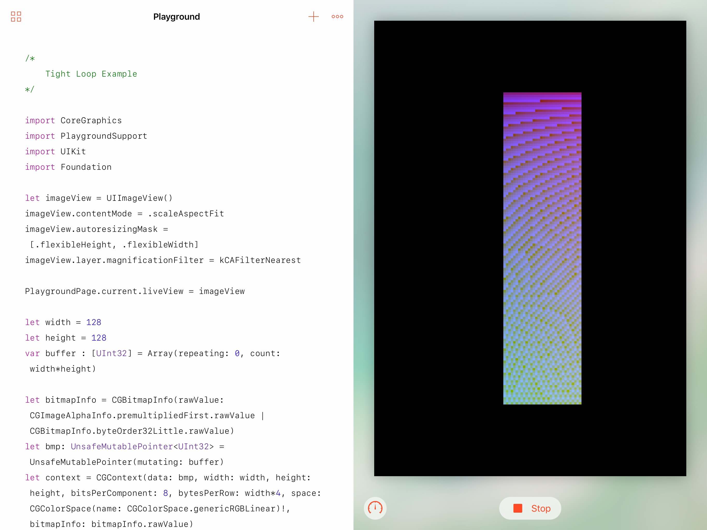 Swift Playgrounds template with logging disabled, enabling much faster performance at the expense of runtime logging & debug information.