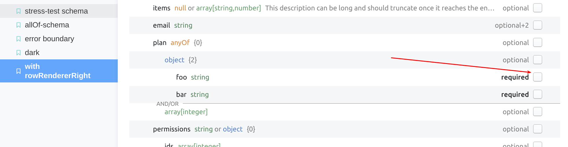rowRendererRightagnostic of the content (will enable Studio to render checkboxes). This component renders arbitrary elements on the right hand side of the row.schemaControlsRendereragnostic of the content (will enable Studio to render 'apply mask' and 'clear mask' buttons). This renders any content right under the JSON SchemarowRendererRighthad any margin or modified height in any way. it resulted in that parent's calculated height to be altered and therefore the relative positionig of divider become broken. We had to usecalcbut it's supported by all major browsers.See a storybook with example checkbox added.