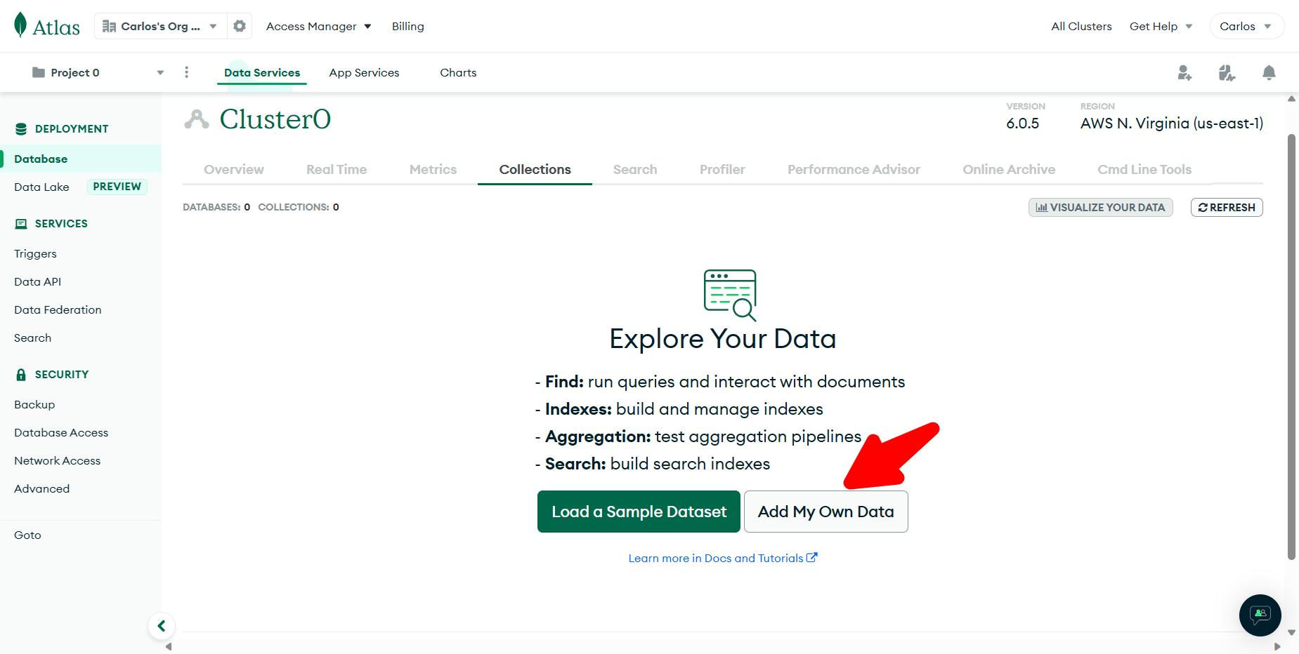 En la vista "Database Deployments", dar click en el boton "Browse Collections"