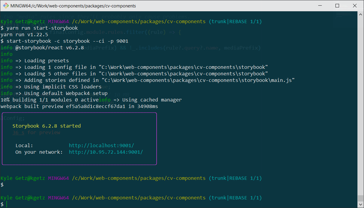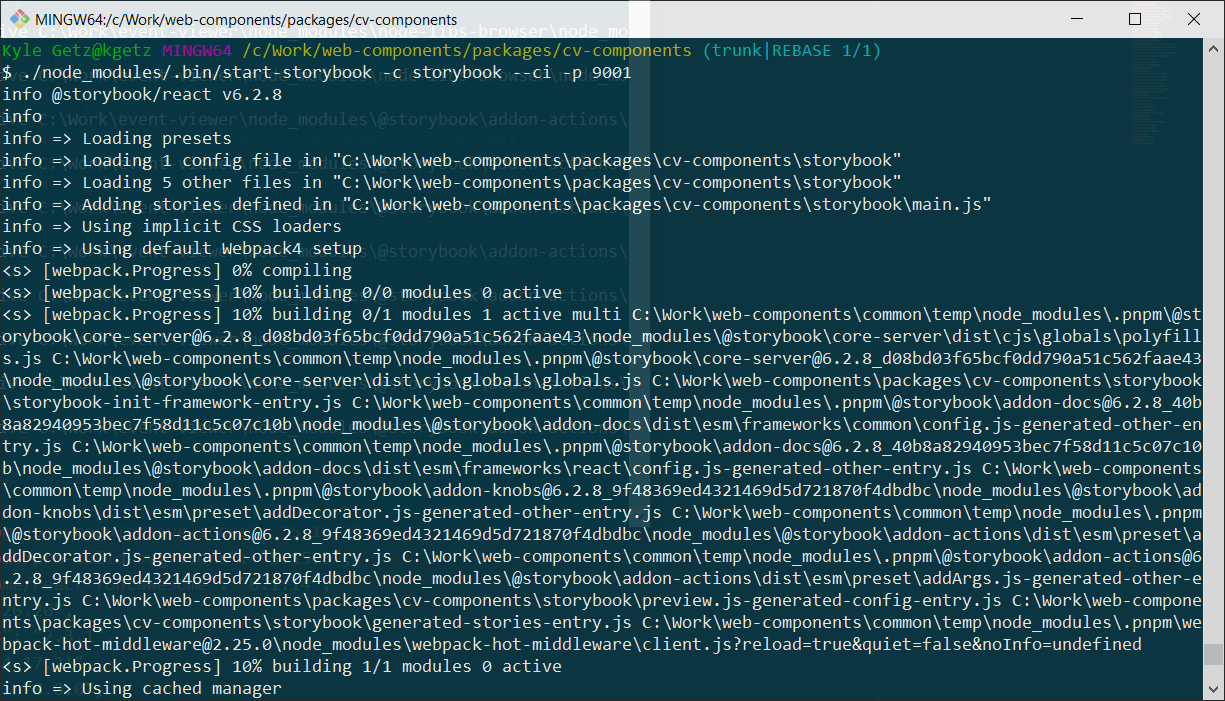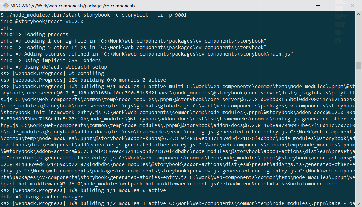 Yeah, this could be related specifically to running Storybook on Windows 10 with the git bash shell. Storybook is the only command-line tool that's exhibited this kind of behavior. For example, webpack uses a progress bar and colored output and I can run that directly and it's just fine. |