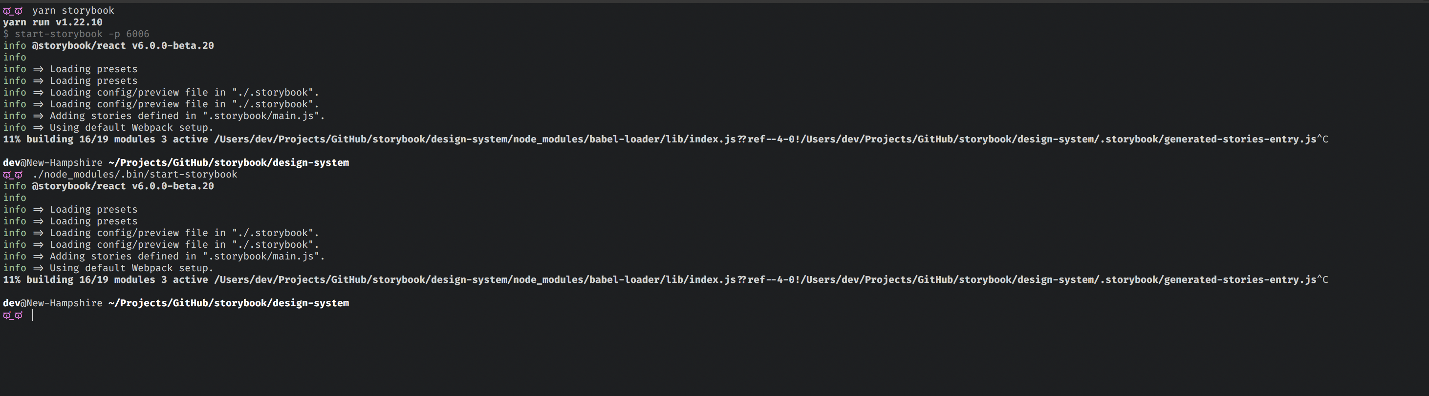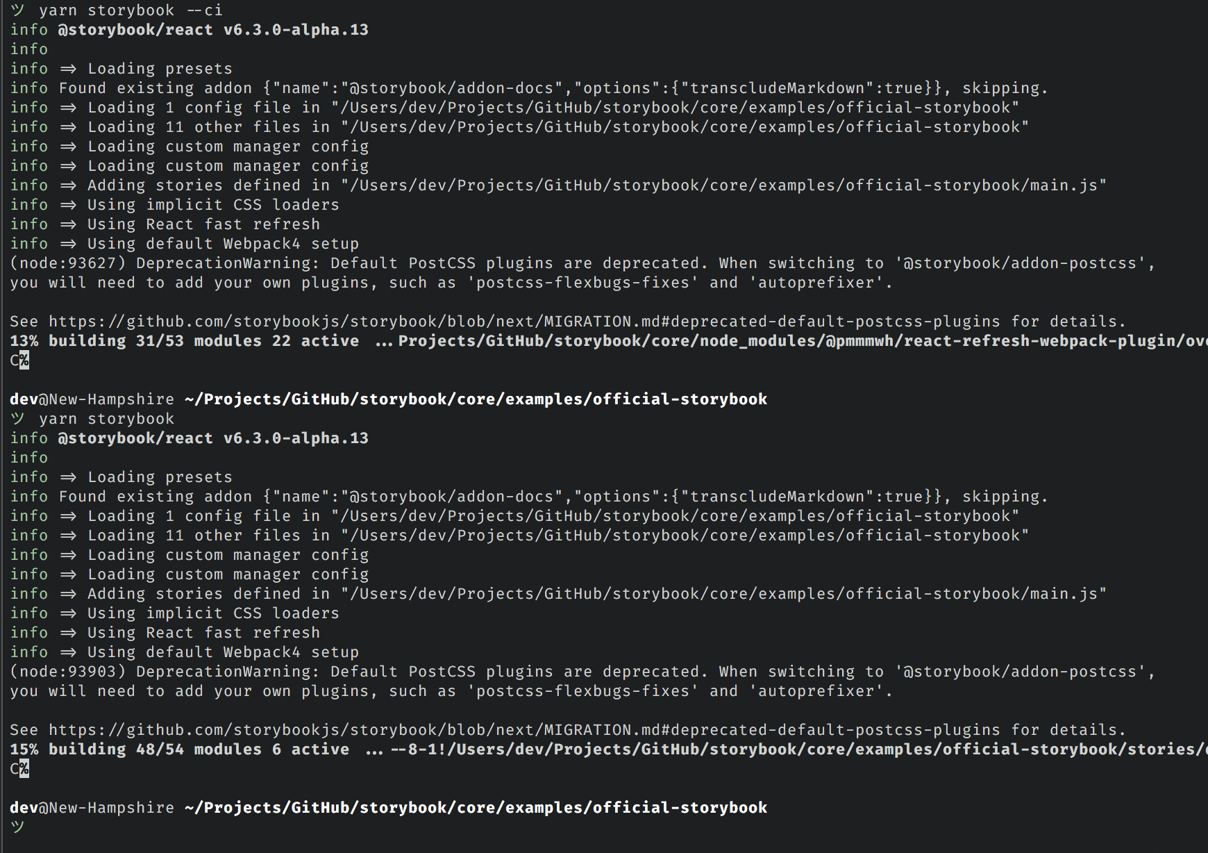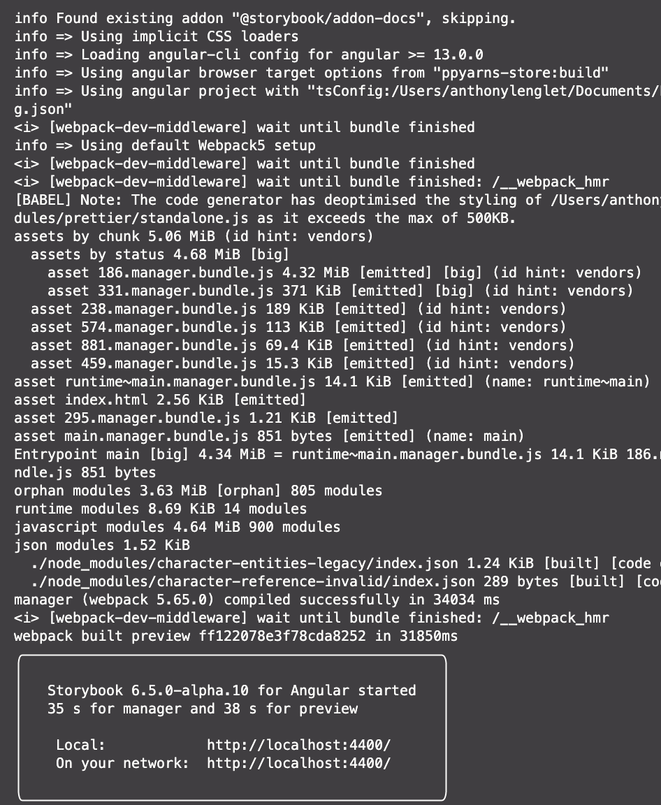 start-storybook seems to have some issues with its output, depending on how it's invoked and what package manager is used.