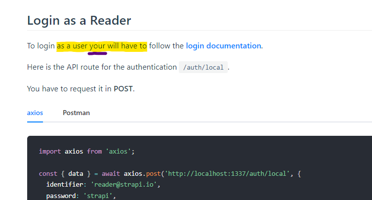 * Removed Slack from the Navbar Community dropdown (#384) * Edit the "Create a Go File" section (#388) The word "built-in" is much more common than "inbuilt". Go has packages, and we don't need to refer to them as "packages/modules". Also, add a missing comma. * remove DO managed db warning (#390) Co-authored-by: Pierre Wizla <pwizla@users.noreply.github.com> * Add hiring link (#387) Co-authored-by: Pierre Wizla <pwizla@users.noreply.github.com> * Case for 1 can be handled in loop (#370) Co-authored-by: Pierre Wizla <pwizla@users.noreply.github.com> * Change code snippet for service create customisation (#372) * Change code snippet for service create customisation * Review changes * VuePress enhancements (#368) * Add consistency * Add strapi & prerequisites Markdown containers Note: Using babel-style for plugins declarations as it seems to work better with multiple declarations for vuepress-plugin-container * Use :::strapi and :::prerequisites in existing docs * Add generic callout, tweak strapi & tip callouts, and clean config file * Clean up unused inline styles from Markdown files * Remove 🤓 from Markdown files in strapi callouts as it's now included * Use generic callout for congratulations in QSG * Add api-call, request and response custom containers * Fully redesign style for request & response containers * Use api-callout container on existing documentation * Remove emoji from :::strapi as it's included * Add 'note' custom callout * Add 'important', 'caution' and 'warning' custom callouts In our mind, they are 3 different levels: - important, the less strong - caution, medium importance ( = VuePress's default 'warning') - warning, the strongest ( = VuePress's default 'danger') * Remove important callout & cleanup CSS We decided that we'll go with a unique callout, "caution". The title can still be adjusted when necessary. * Merge branch 'repo/snippets' into repo/vuepress-enhanced * Apply new callouts and minimal tab styles everywhere * Apply minimal tabs to integration guides * Update VuePress to 1.8.2 * Temporarily setting root url (testing Vercel deploy) * Revert "Temporarily setting root url (testing Vercel deploy)" This reverts commit ba7b7d264b38c844ae6f5131f851f715560c8ec4. * Use code-blocks and code-groups everywhere appropriate * Tweak request/response CSS based on designers feedback * Simplify some wordings in i18n doc * Apply api-call/request/response containers throughout the docs * Tweak request/response CSS for use outside of :::api-call * Update callouts in the user guide * Remove Google Analytics Vuepress plugin and add GTM See [this PR](https://github.com/strapi/documentation/pull/380) * Temp remove yarn.lock to fix conflicts * Fix emoji for warning callout * Converting warning to note callout in Templates file * Fix QSG callouts * Add yarn.lock * Remove marketing note at end of 21yunbox hosting guide * Removing GTM script from plugins (it's already in head) * Don't make text prop required in badges as a default is already provided Co-authored-by: Mégane Lacheny <megane.lacheny@strapi.io> * Highlight active tab in blue instead of default VuePress green (#393) * Fix CLI commands for Hand-on path in QSG (#395) * Launch the server: added steps to execute build & start on windows (#394) Co-authored-by: Pierre Wizla <pwizla@users.noreply.github.com> * Remove breaking markdown on laravel page (#398) * Remove breaking markdown on laravel page There was a line that broke the layout of the entire page, making everything after the tag be placed inline. By removing this it will all be normal and readable again. * Close a block in the angular documentation * Close a block in the gridsome documentation * Close a block in the 11ty documentation * Update python.md (#400) Fixed the syntax error in line 125. * Update laravel.md (#402) Fixed a wrong word * small grammar fix (#405) from "is uses" to "uses" * Update is/are conjugation mistake in FAQ (#406) * Add Okta example to SSO (#396) Co-authored-by: Pierre Wizla <pwizla@users.noreply.github.com> * Grammar correction (#414) * Use a nodejs version supported by Strapi (#411) Node v10 is not supported anymore. See https://strapi.io/documentation/developer-docs/latest/setup-deployment-guides/deployment.html Use Node v14 in Standard Environment. See https://cloud.google.com/appengine/docs/standard/nodejs/runtime#node.js-14 Note about Flexible Environment: It will derive the right Node version from package.json. See https://cloud.google.com/appengine/docs/flexible/nodejs/runtime Co-authored-by: Pierre Wizla <pwizla@users.noreply.github.com> * Fix socketPath usage on google app engine (#392) See https://stackoverflow.com/a/67395883/856702 Co-authored-by: Pierre Wizla <pwizla@users.noreply.github.com> * Update laravel.md (#410) A config file is needed Co-authored-by: Pierre Wizla <pwizla@users.noreply.github.com> * Fix for the Okta sample config (#419) * Fix grammar (#421) * Update migration-guide-3.4.x-to-3.4.4.md * Update migration-guide-3.4.x-to-3.4.4.md * Update sentence for initializer in folder structure (#426) * Update README.md (#427) Update Node version: https://strapi.io/documentation/developer-docs/latest/setup-deployment-guides/installation/cli.html#preparing-the-installation `Node.js (opens new window): only LTS versions are supported (version 12.x minimum). Other versions of Node.js may not be compatible with the latest release of Strapi. The 14.x version is most recommended by Strapi.` * [dev/latest-guides-auth-request] Fixed grammatical error (#431) * Fixed grammatical error * Fixed to better match style guide Co-authored-by: Pierre Wizla <pwizla@users.noreply.github.com> Co-authored-by: Pierre Wizla <pwizla@users.noreply.github.com> * npm build command doesn't work. Use npm run build (#440) See: https://stackoverflow.com/questions/29939697/npm-build-doesnt-run-the-script-named-build-in-package-json This should also be updated across the docs wherever its found. Maybe I'll go hunting soon if this one gets merged (first